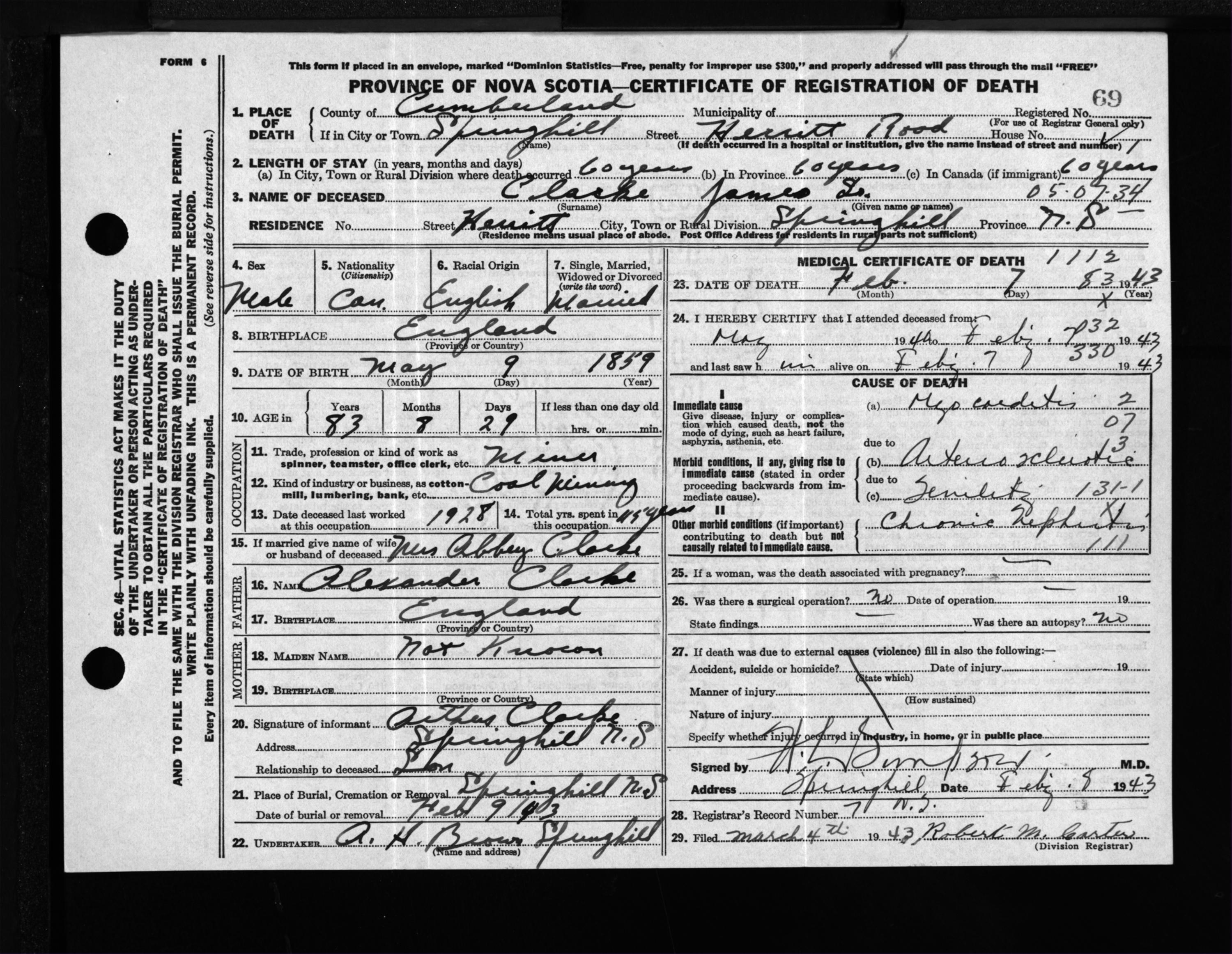 Male Death Registration: Year: 1943 file: 213 number: 69