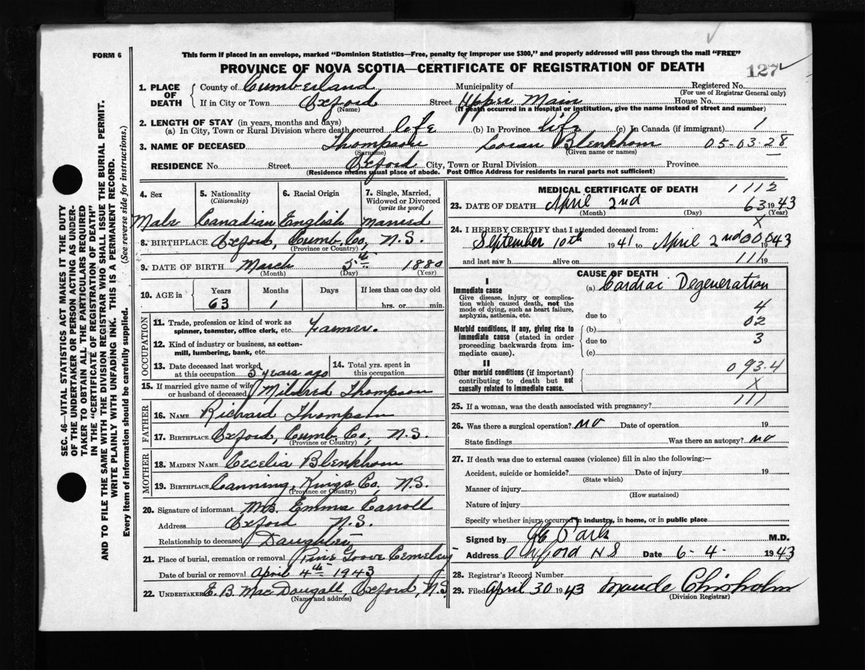 Male Death Registration: Year: 1943 file: 213 number: 127