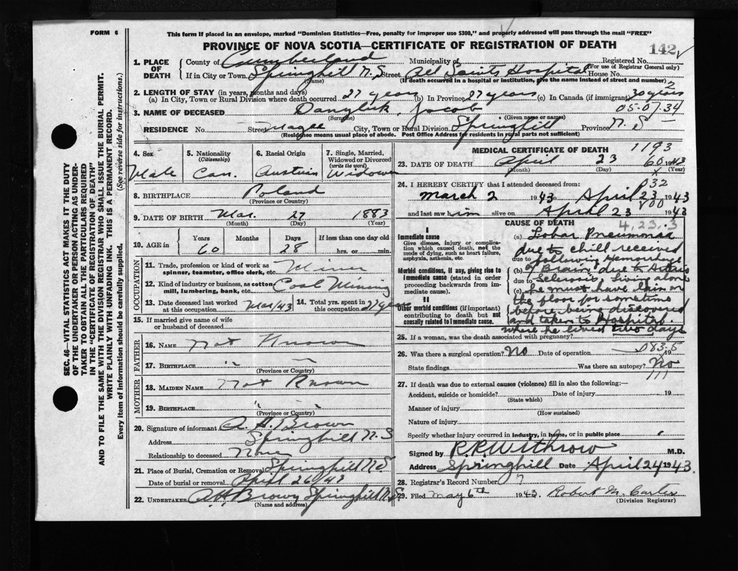 Male Death Registration: Year: 1943 file: 213 number: 142