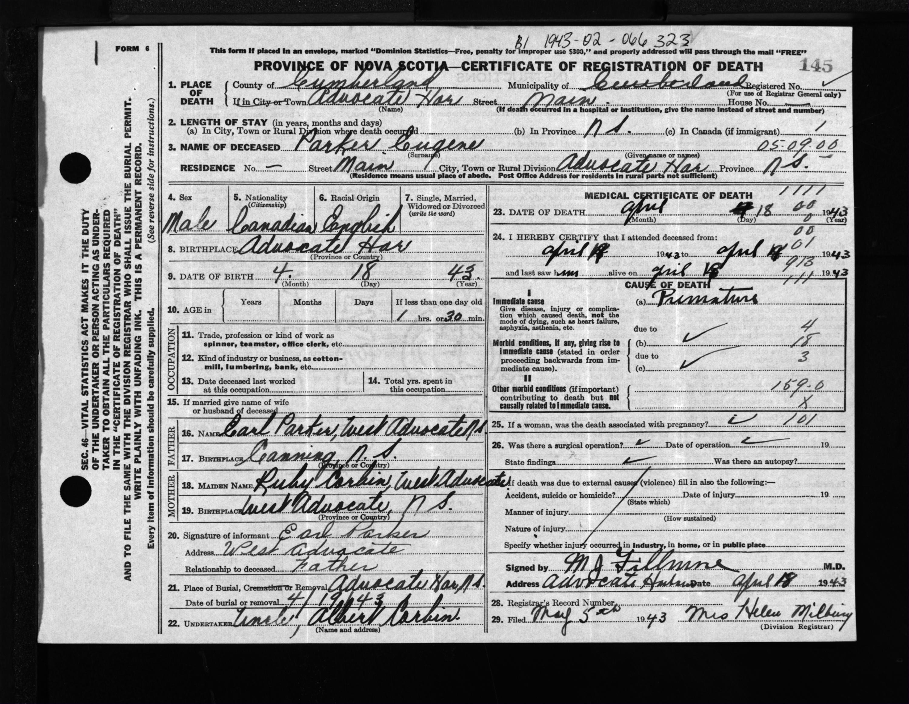 Male Death Registration: Year: 1943 file: 213 number: 145