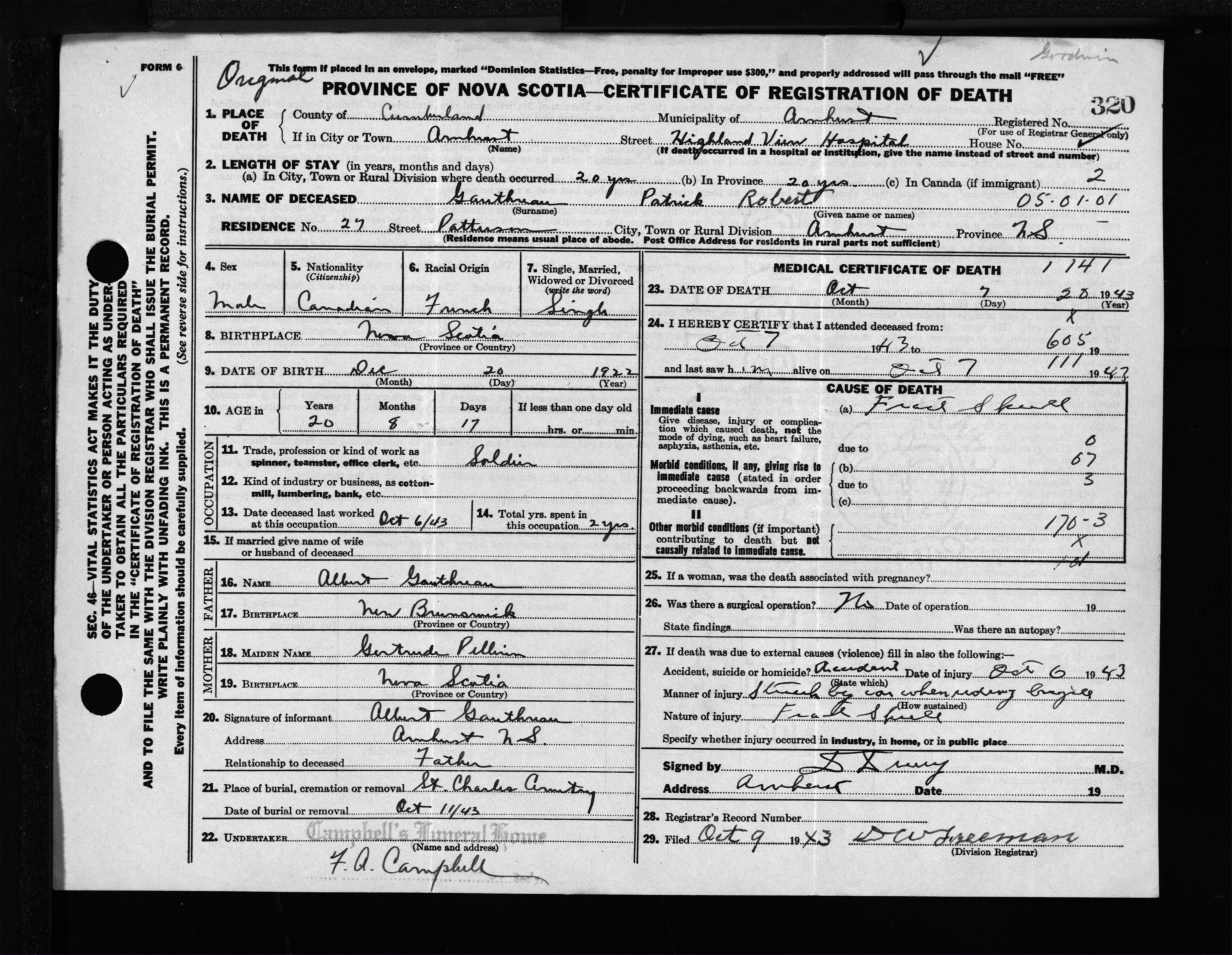 Male Death Registration: Year: 1943 file: 213 number: 320