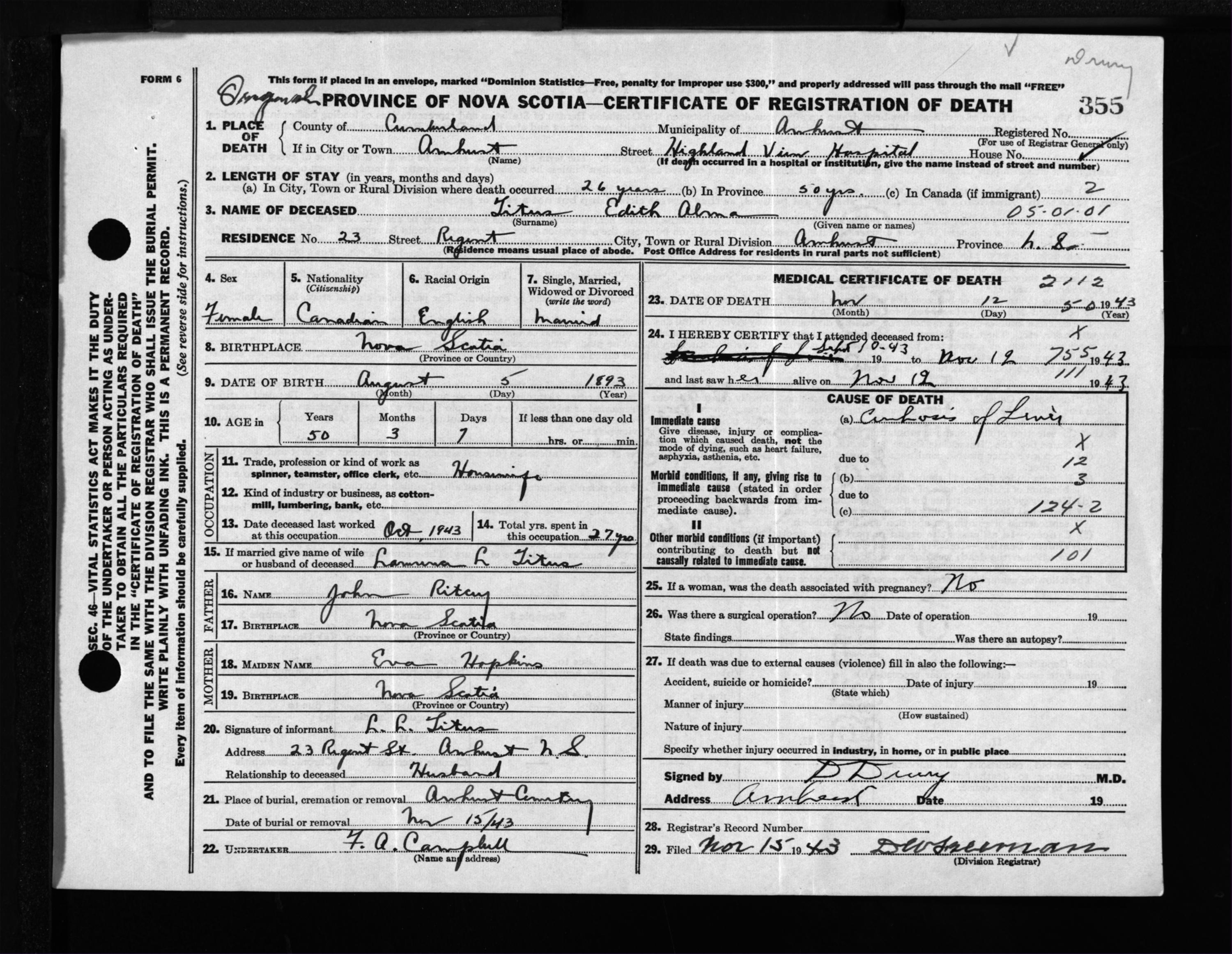 Female Death Registration: Year: 1943 file: 213 number: 355