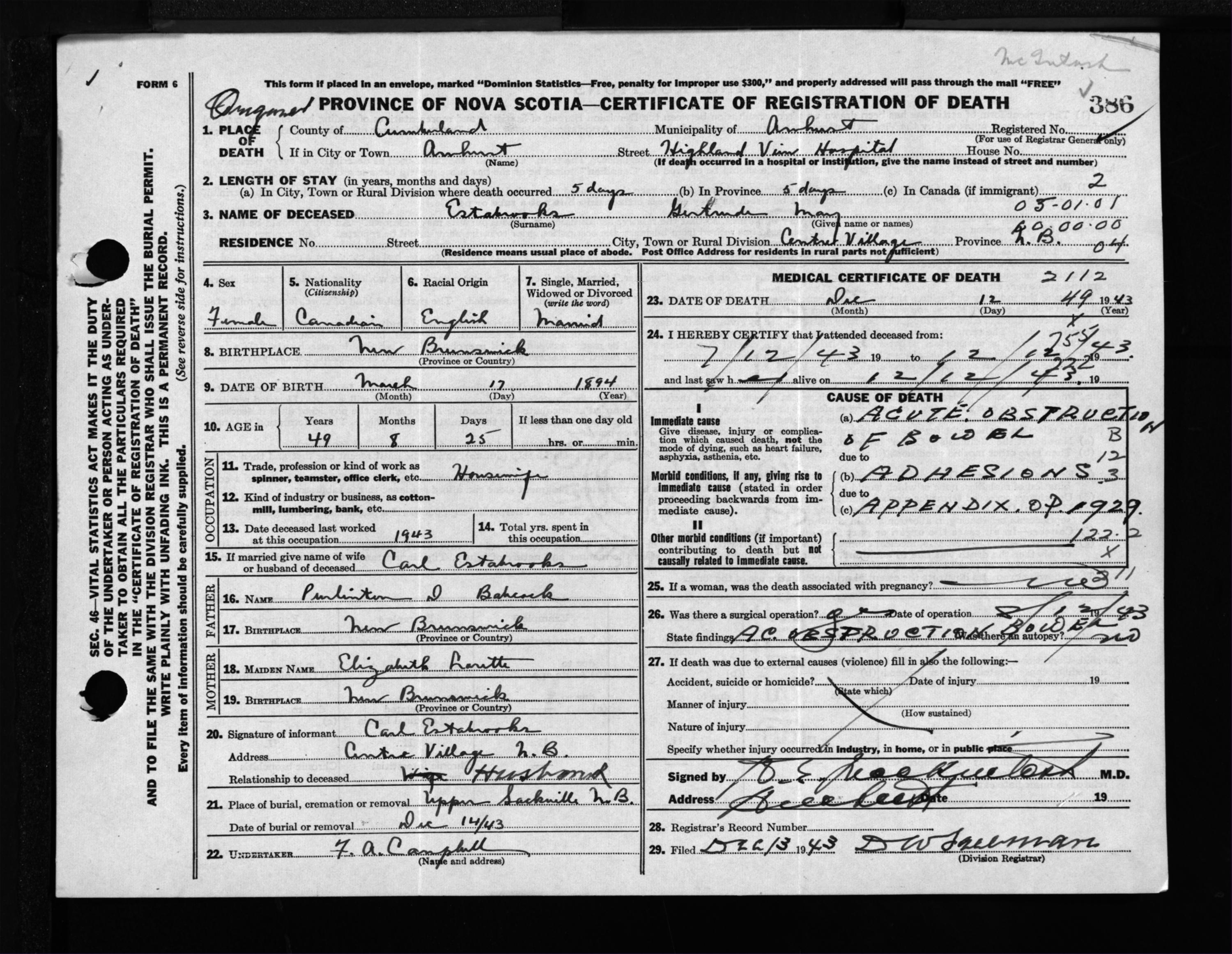 Female Death Registration: Year: 1943 file: 213 number: 386