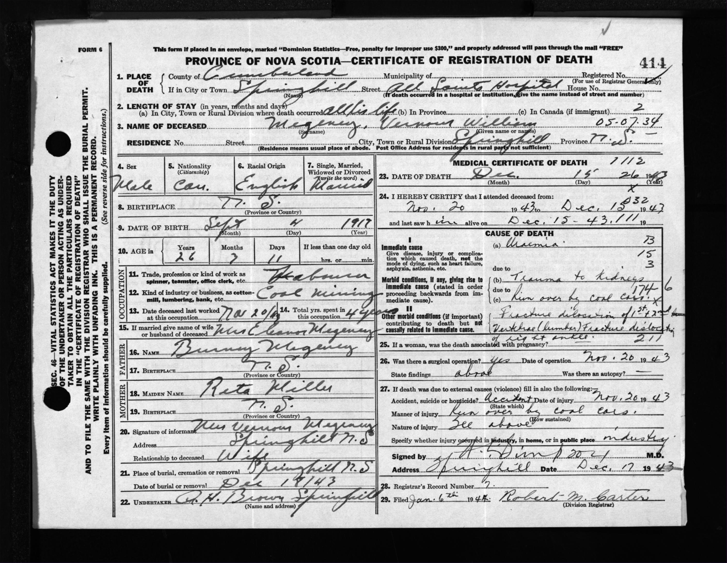 Male Death Registration: Year: 1943 file: 213 number: 414