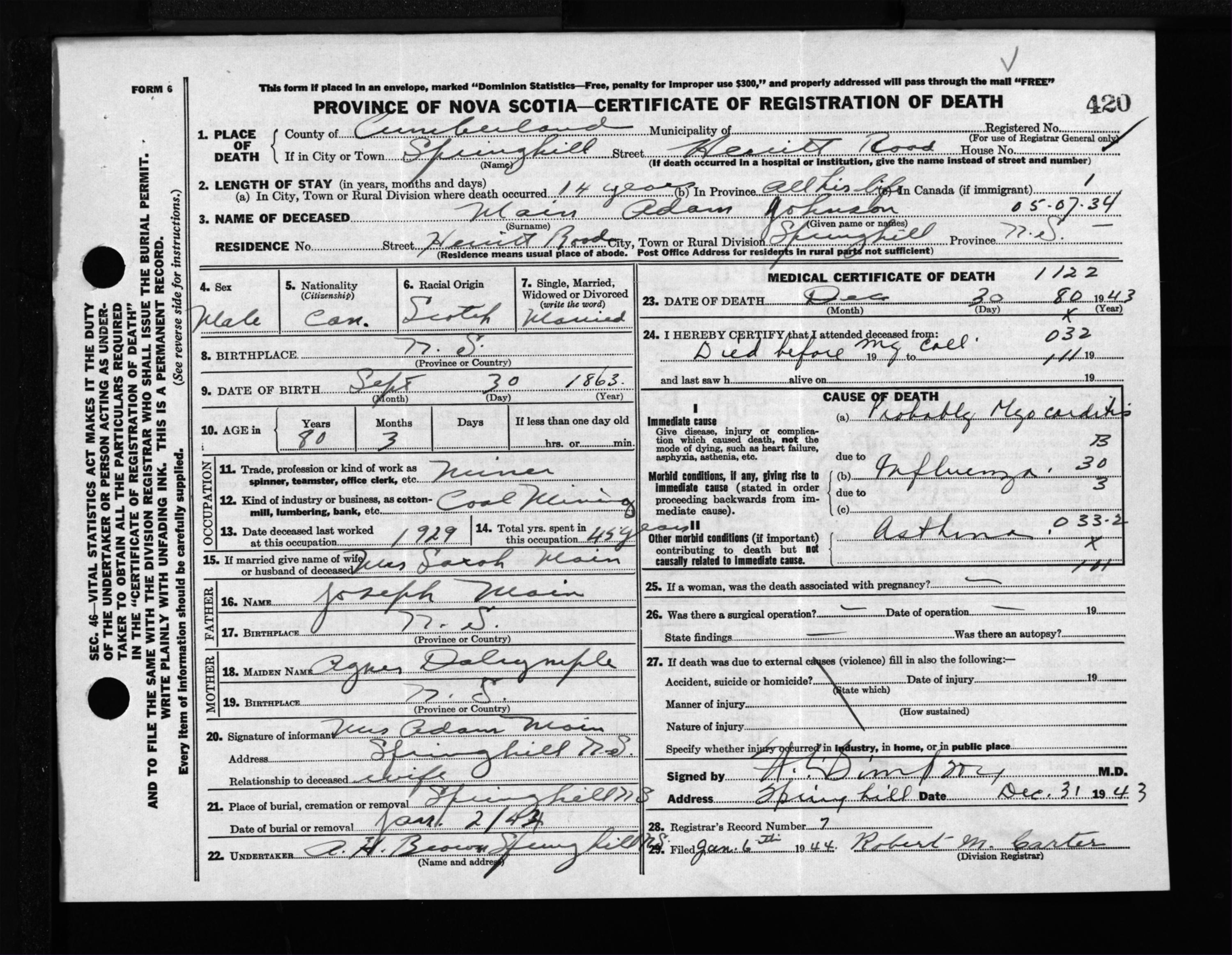 Male Death Registration: Year: 1943 file: 213 number: 420