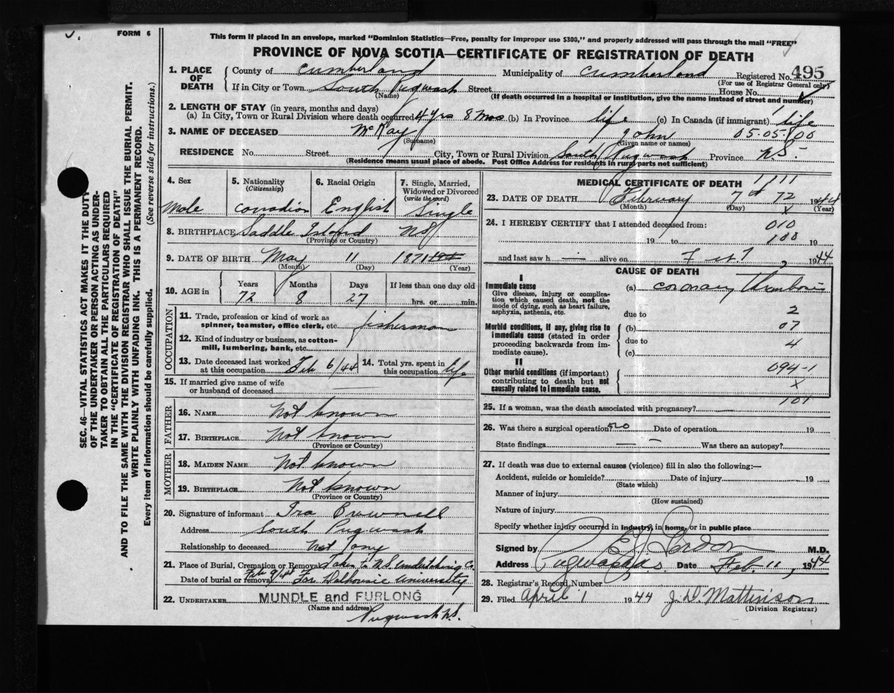 Male Death Registration: Year: 1944 file: 213 number: 495