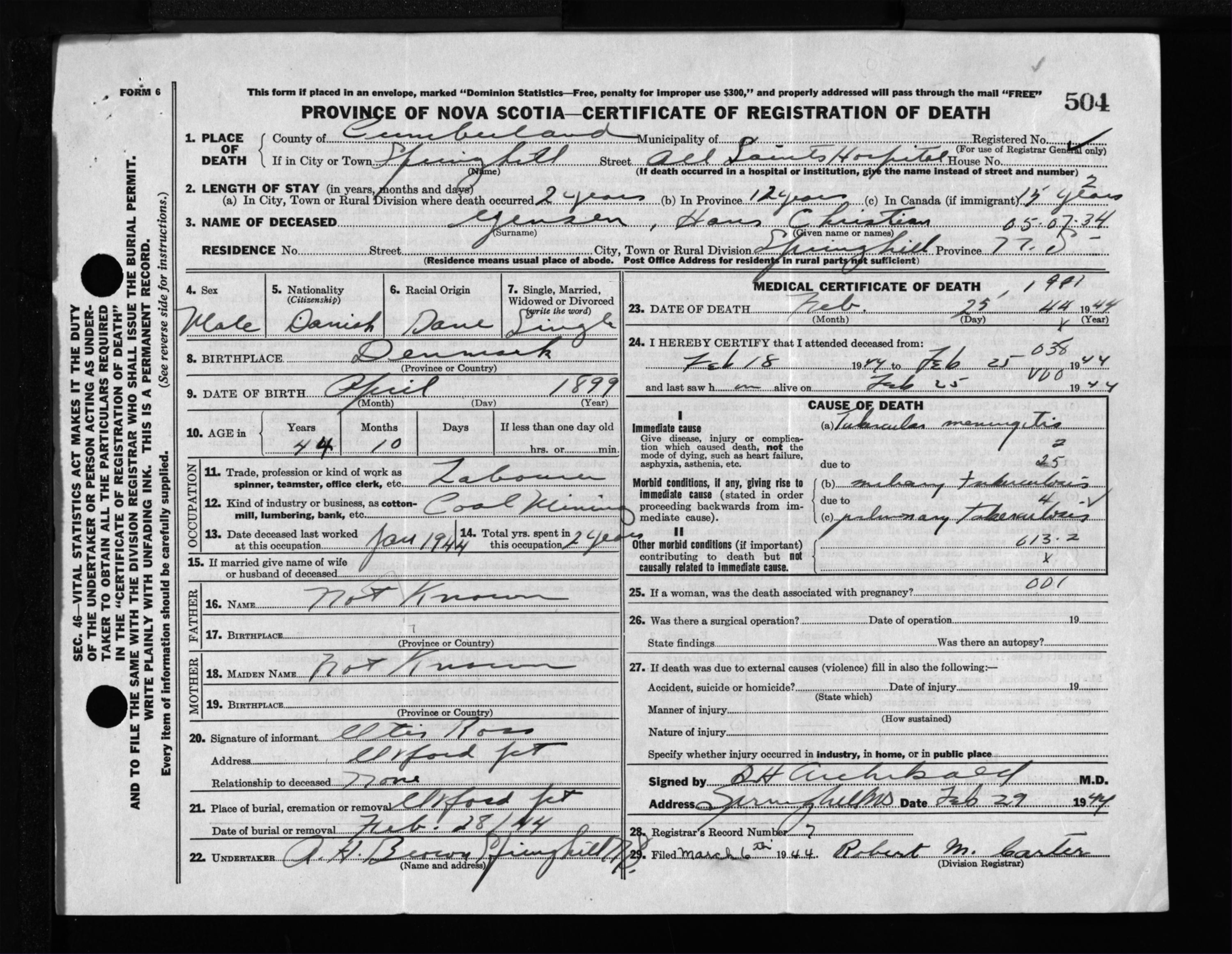Male Death Registration: Year: 1944 file: 213 number: 504