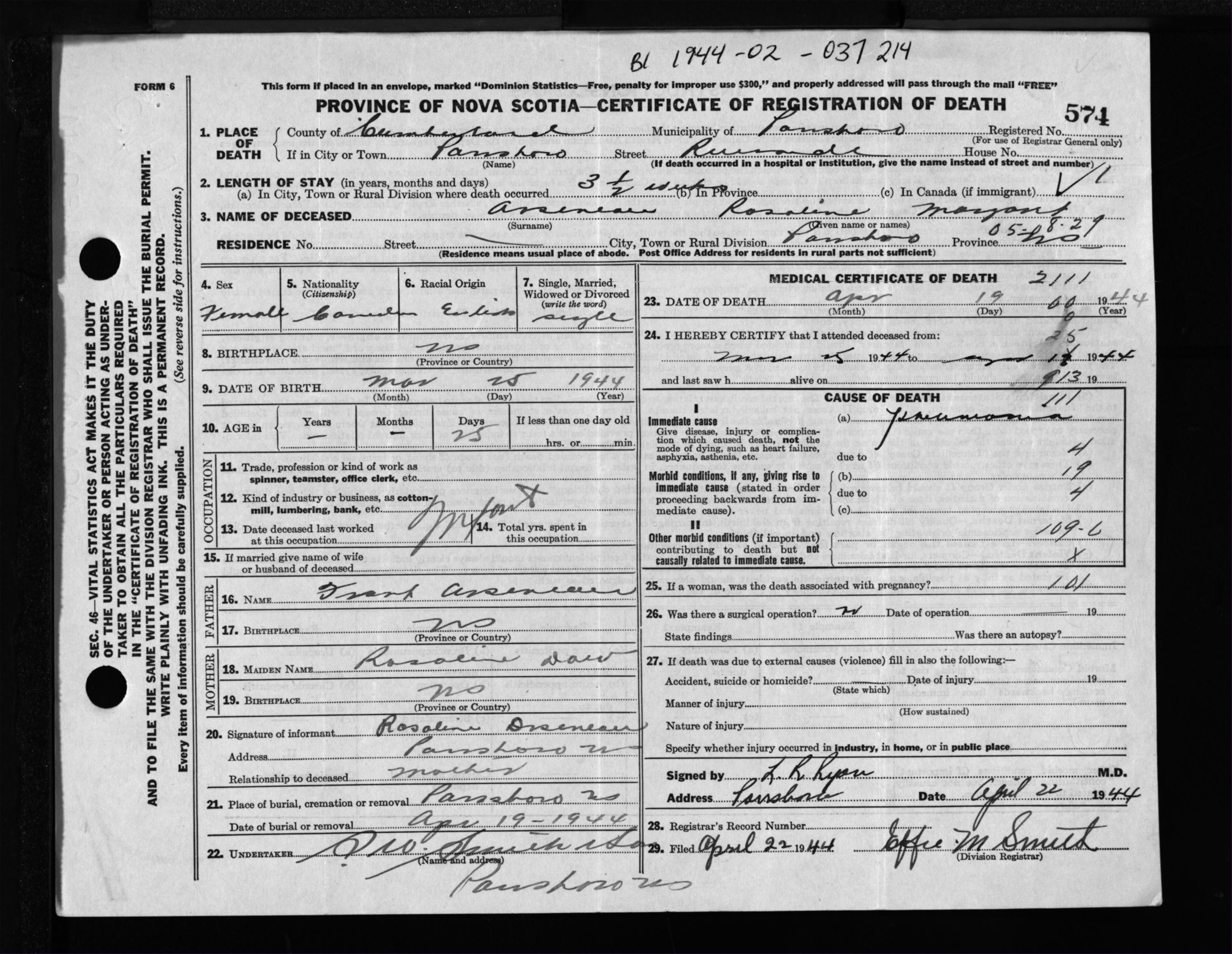 Female Death Registration: Year: 1944 file: 213 number: 574