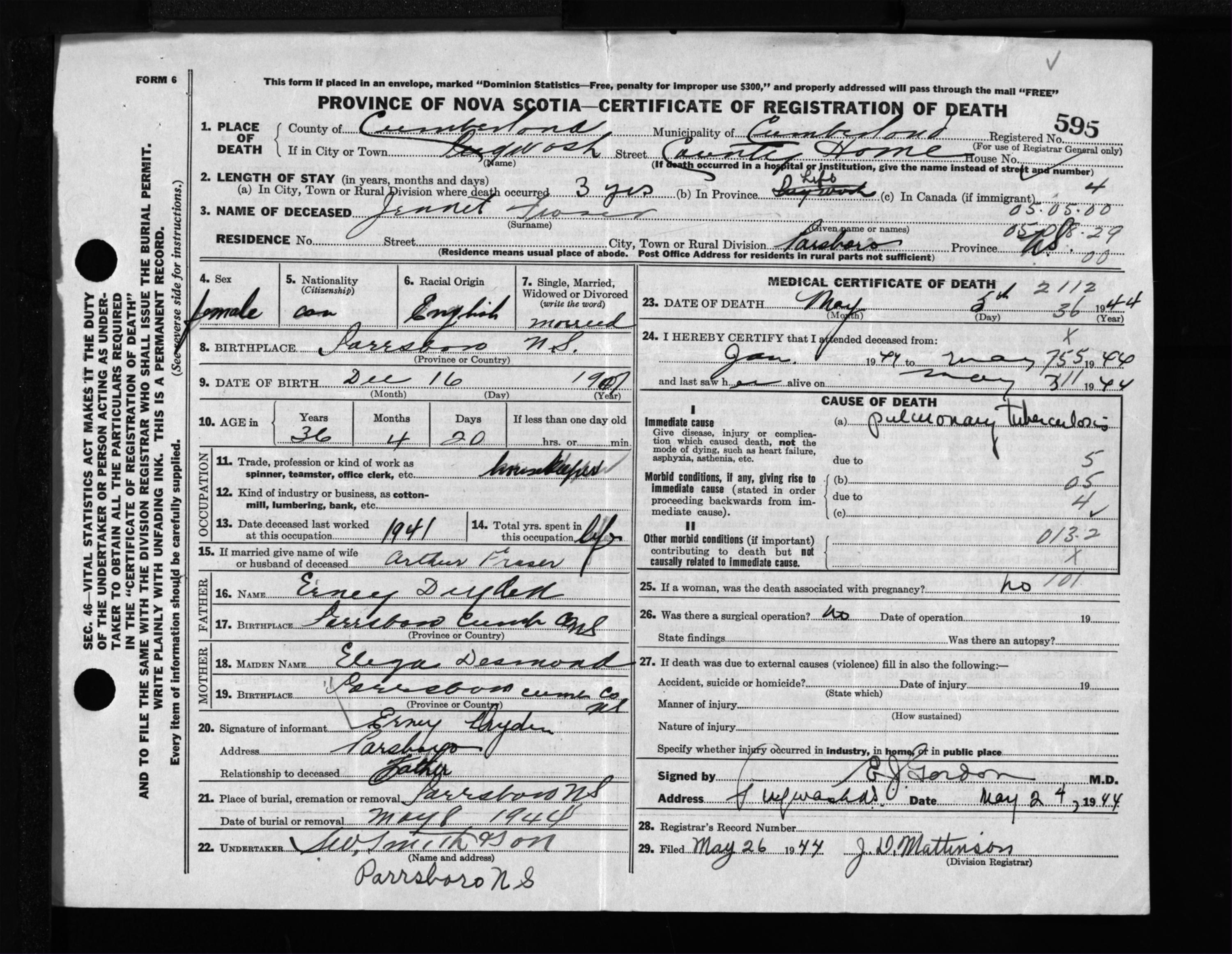 Female Death Registration: Year: 1944 file: 213 number: 595