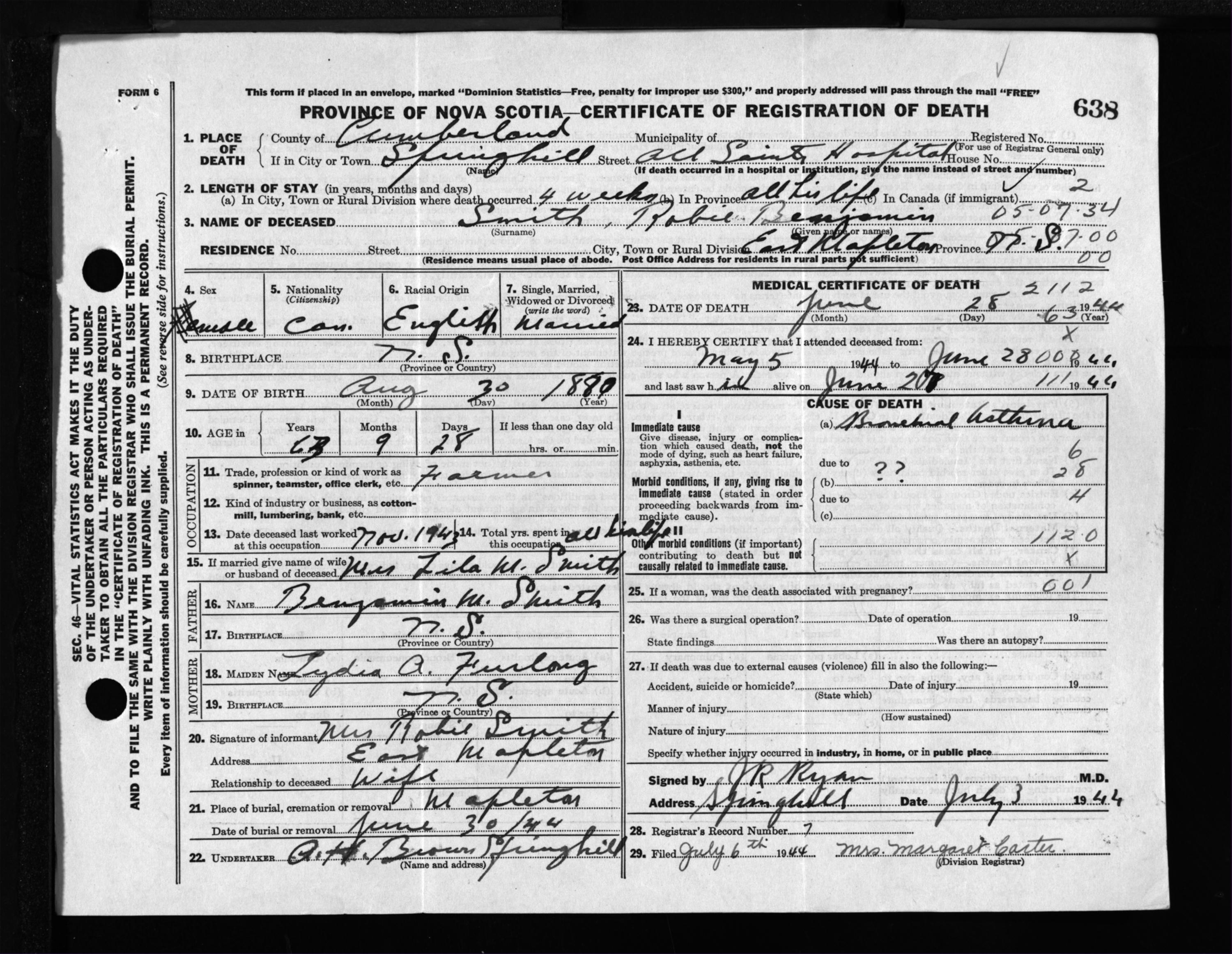 Male Death Registration: Year: 1944 file: 213 number: 638