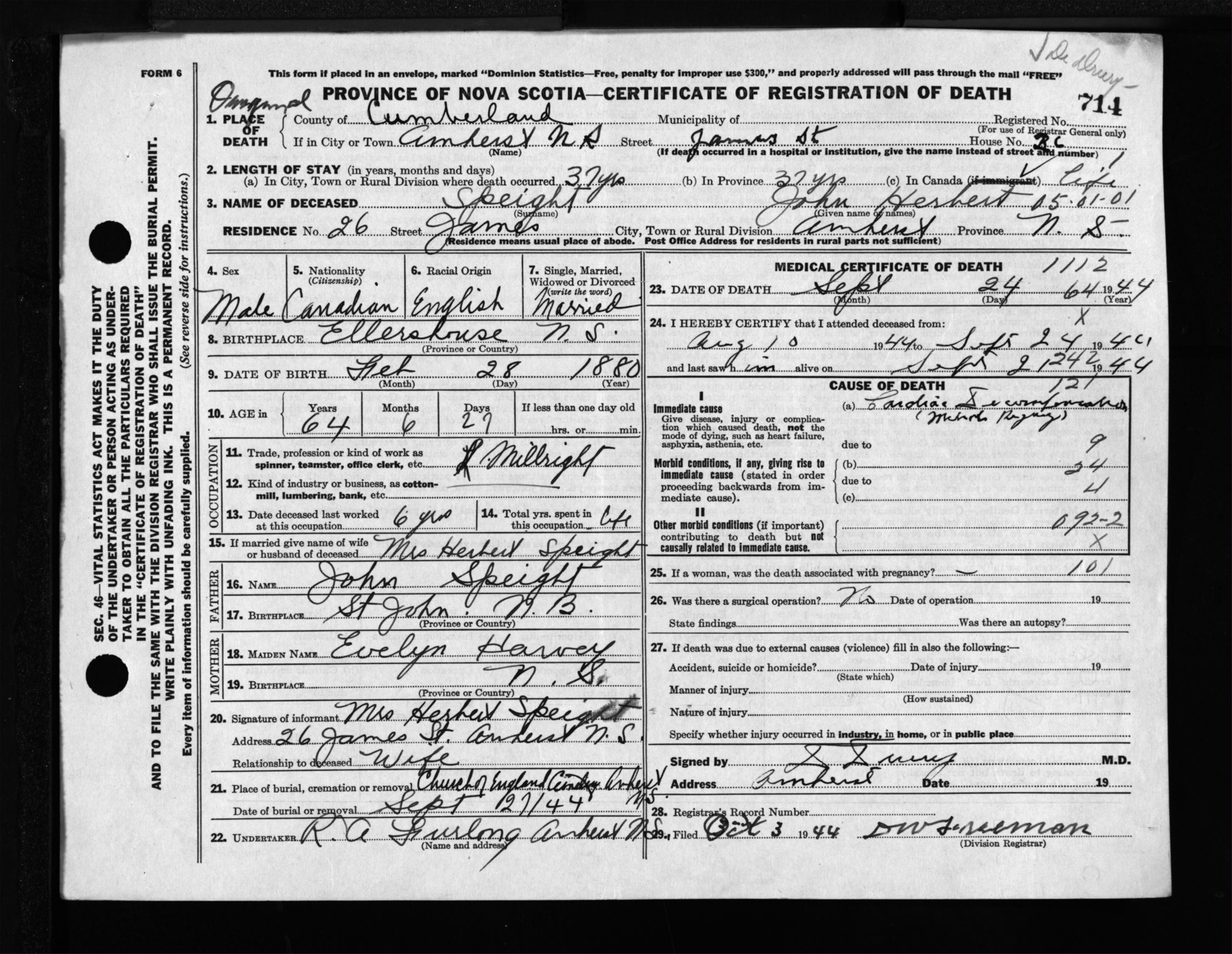 Male Death Registration: Year: 1944 file: 213 number: 714