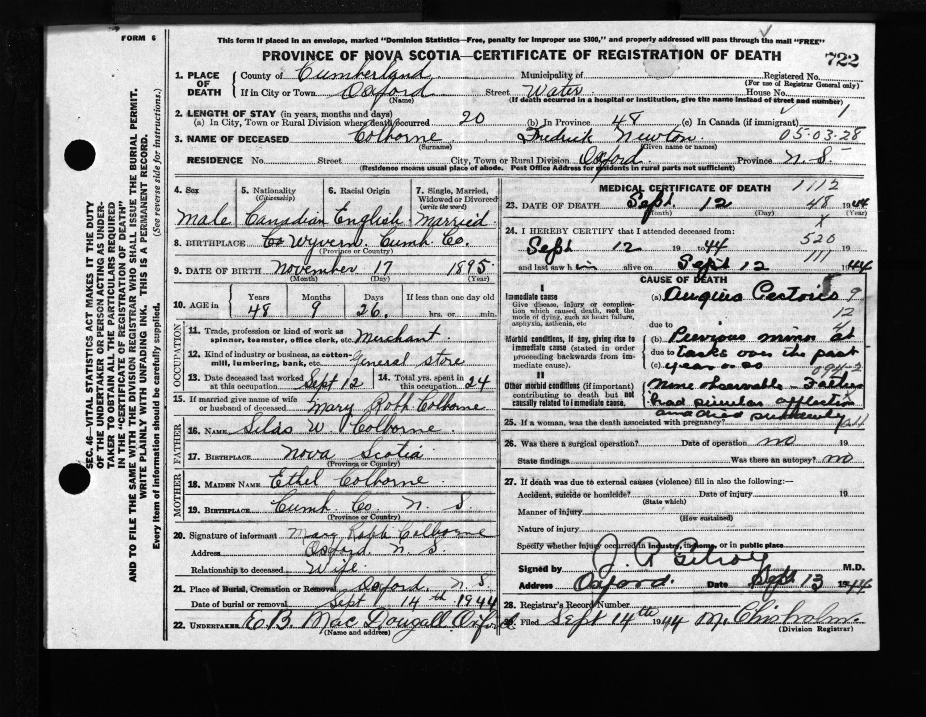 Male Death Registration: Year: 1944 file: 213 number: 722