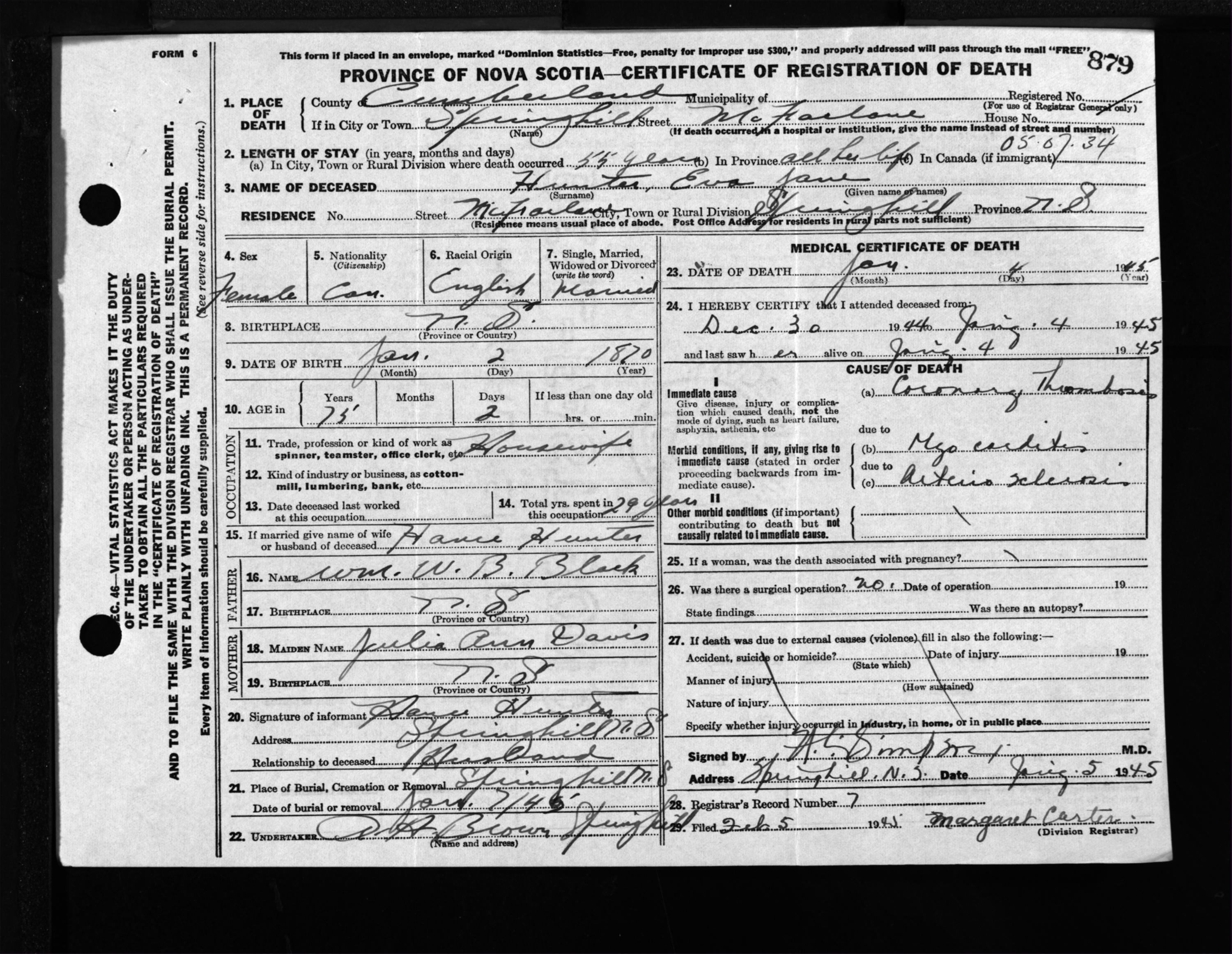 Female Death Registration: Year: 1945 file: 213 number: 879