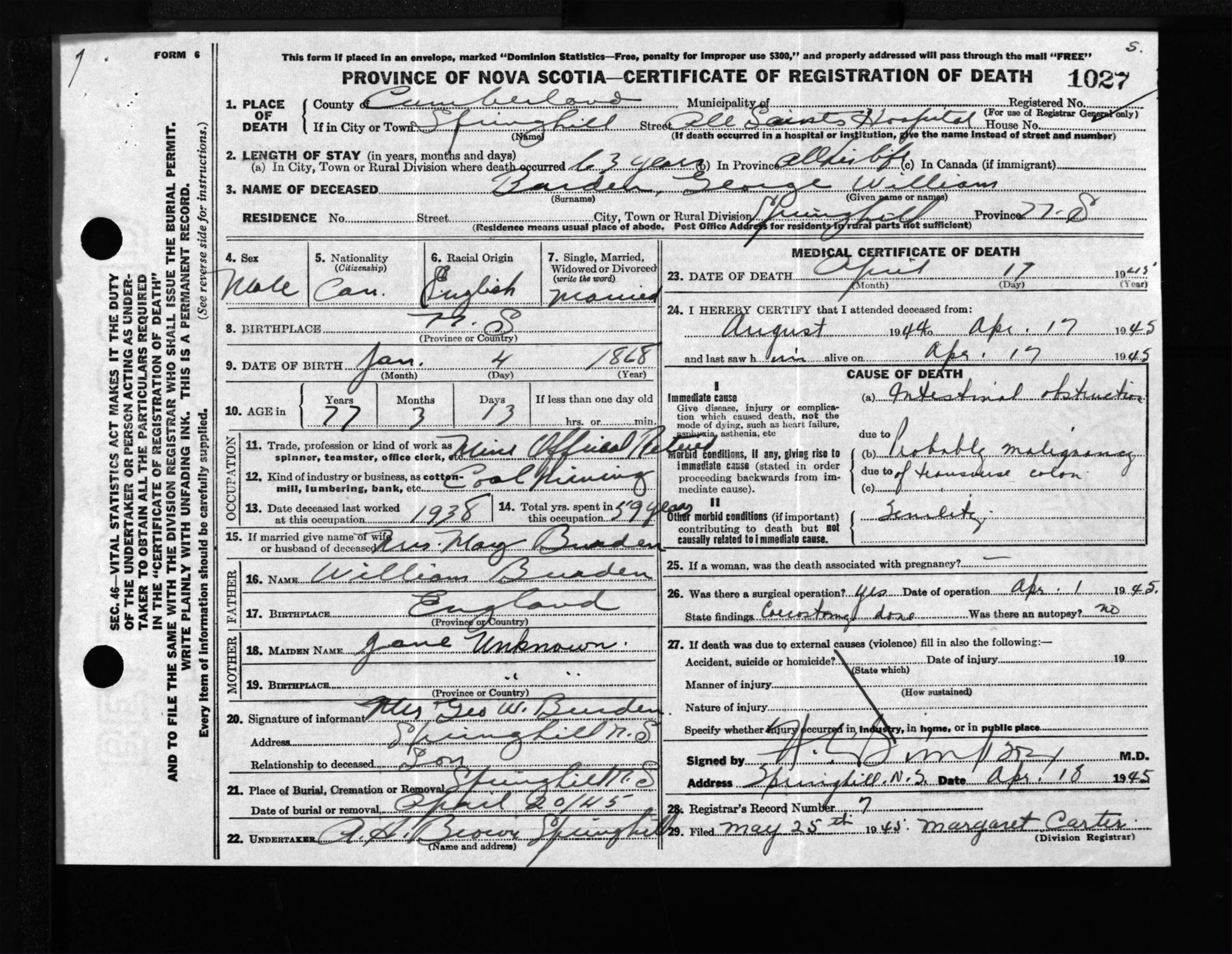 Male Death Registration: Year: 1945 file: 213 number: 1027