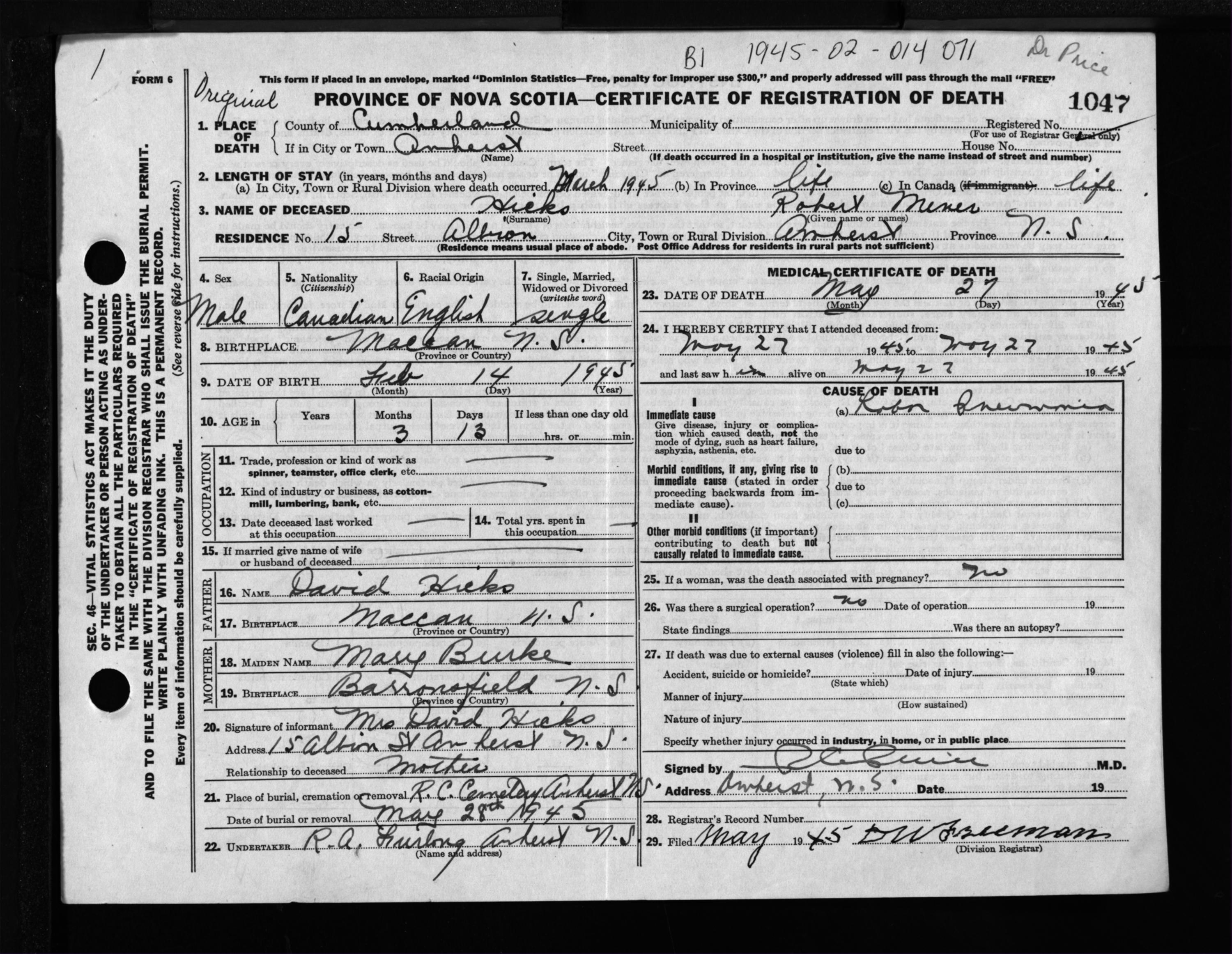 Male Death Registration: Year: 1945 file: 213 number: 1047