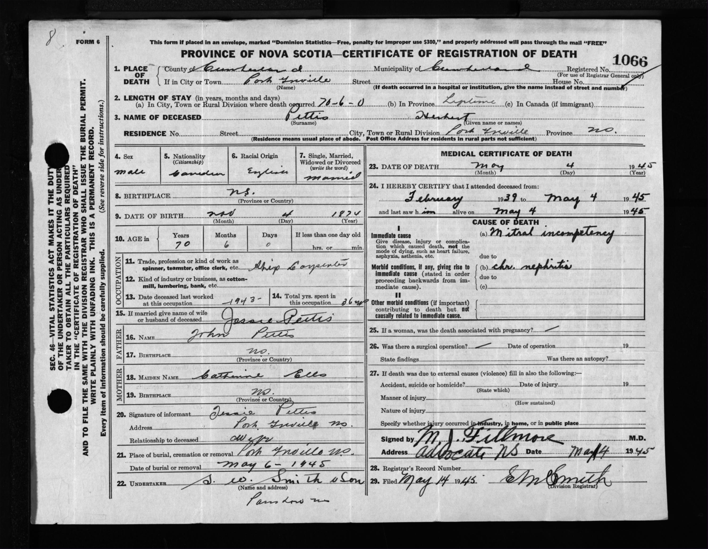 Male Death Registration: Year: 1945 file: 213 number: 1066