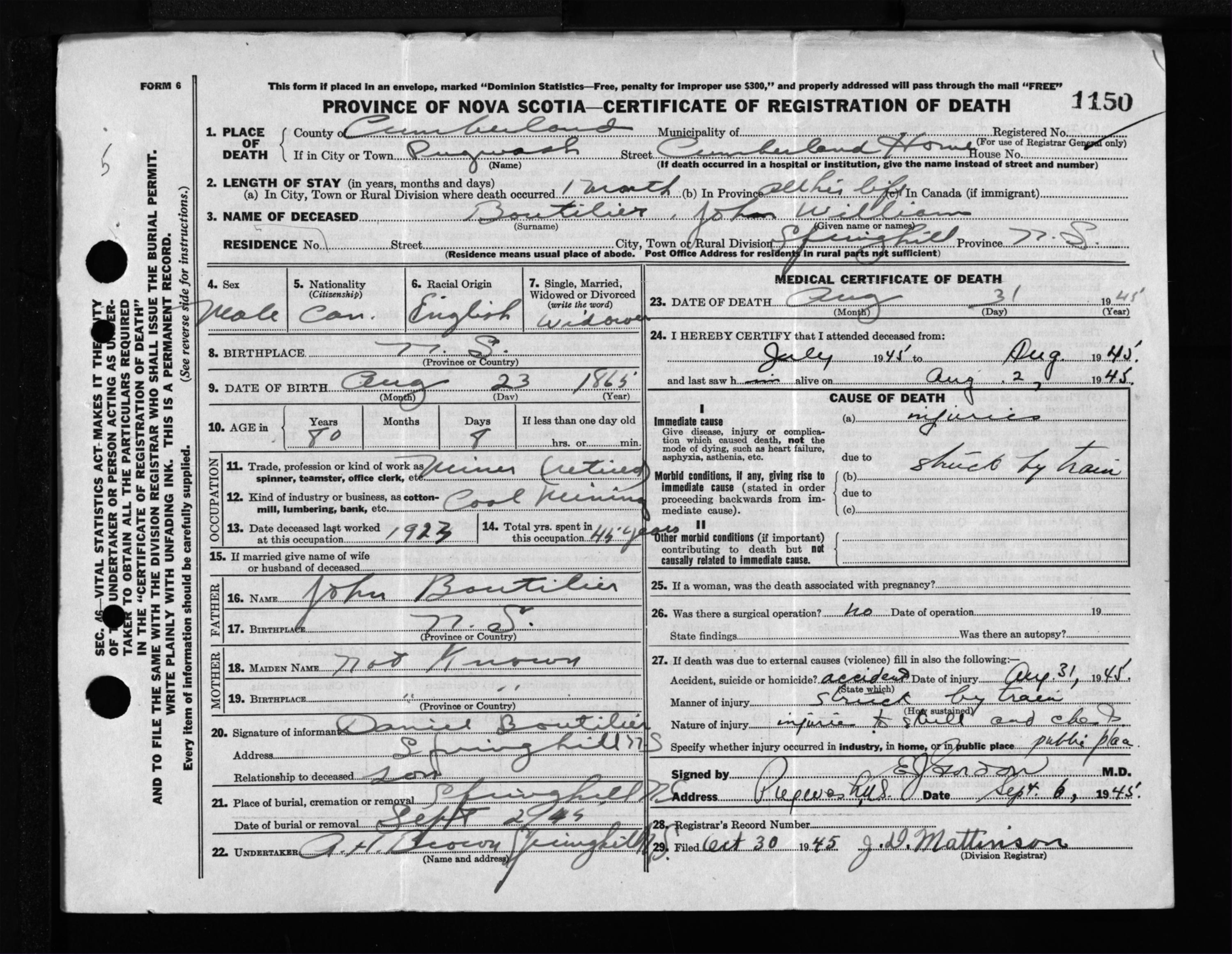 Male Death Registration: Year: 1945 file: 213 number: 1150