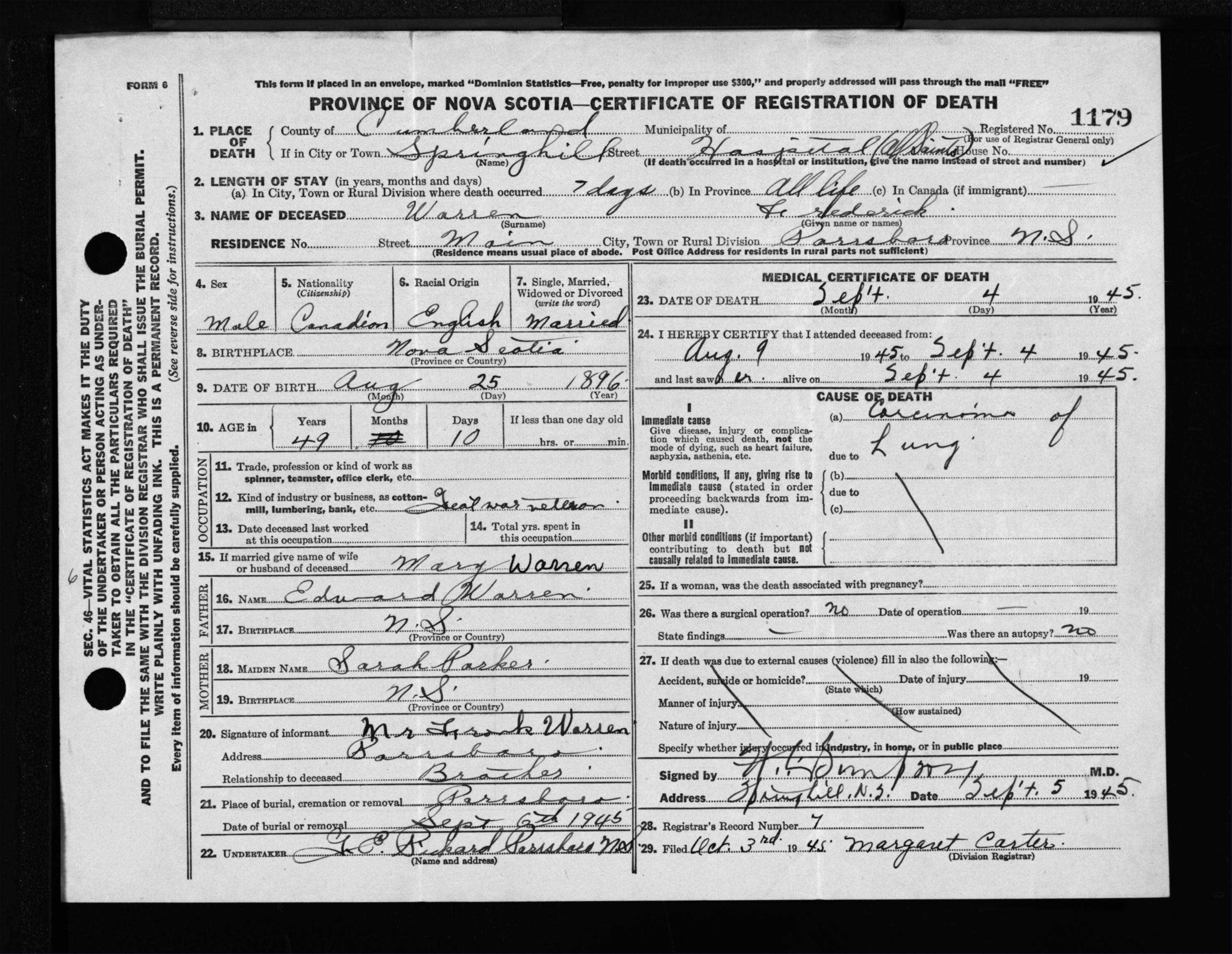 Male Death Registration: Year: 1945 file: 213 number: 1179