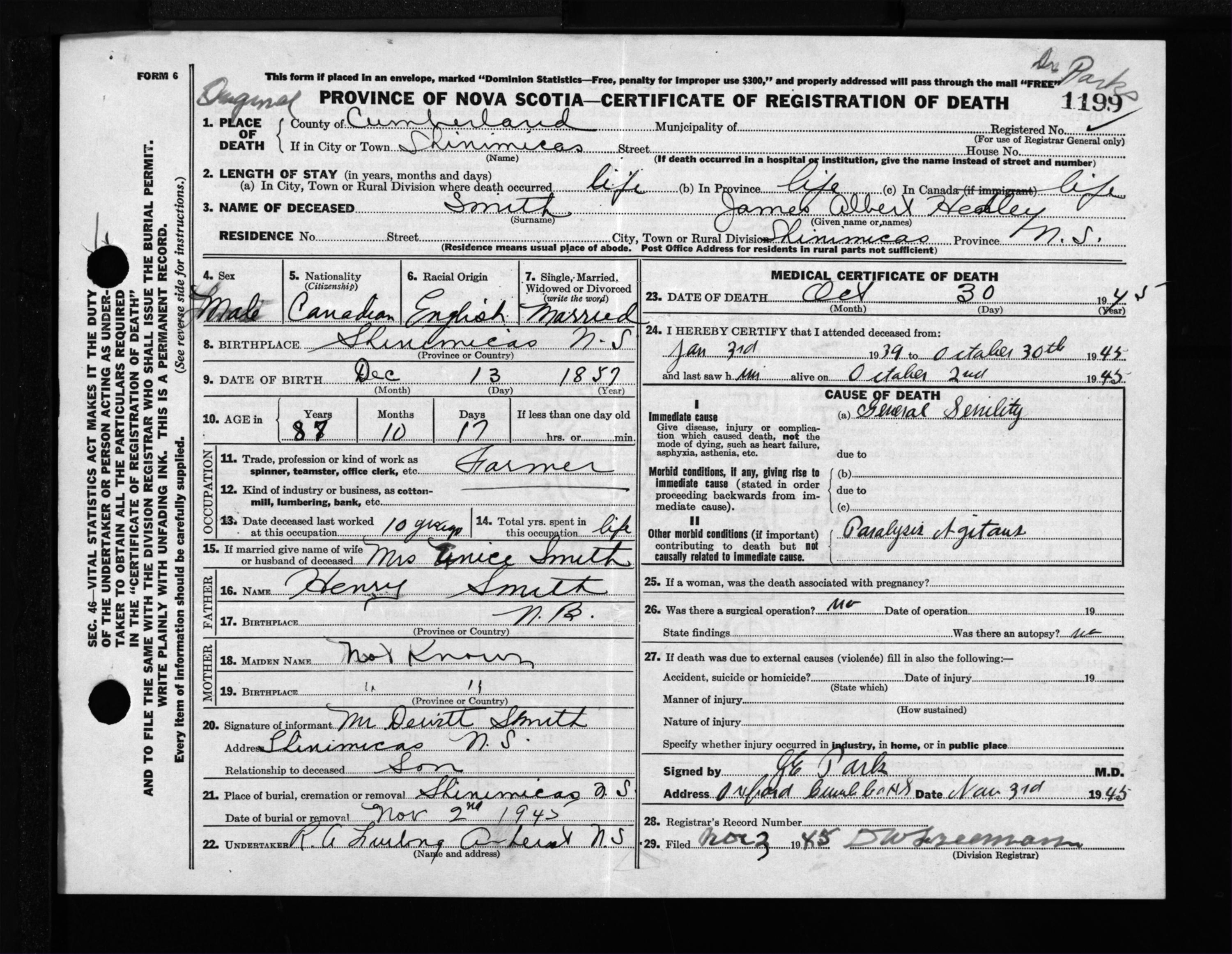 Male Death Registration: Year: 1945 file: 213 number: 1199