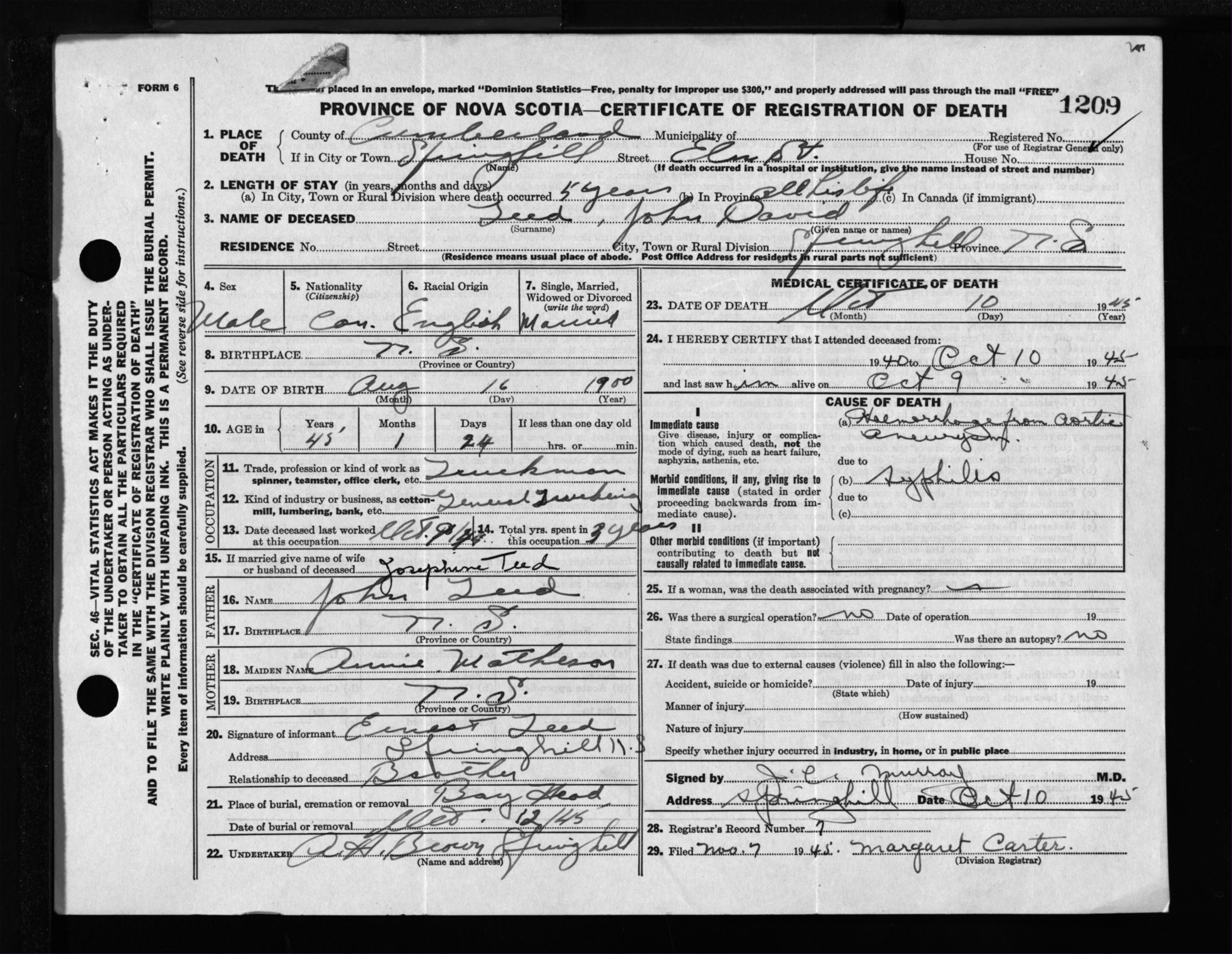 Male Death Registration: Year: 1945 file: 213 number: 1209