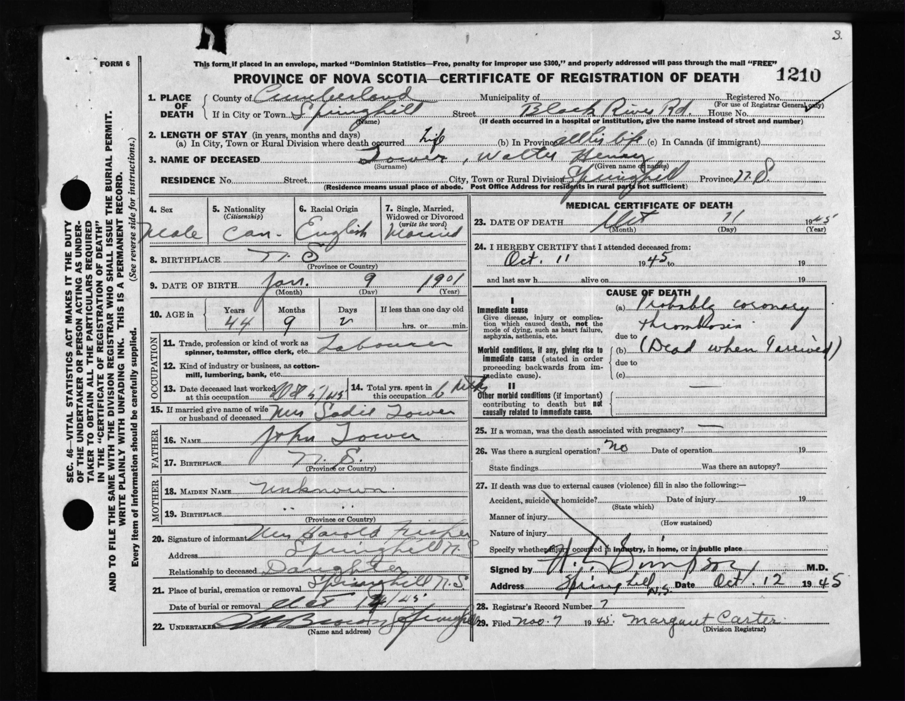 Male Death Registration: Year: 1945 file: 213 number: 1210