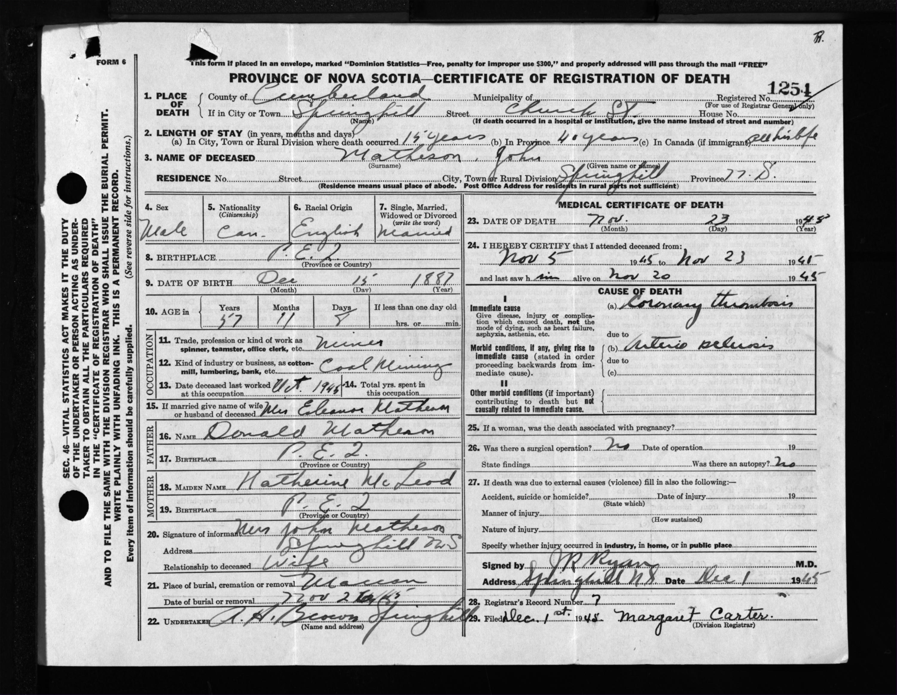Male Death Registration: Year: 1945 file: 213 number: 1254