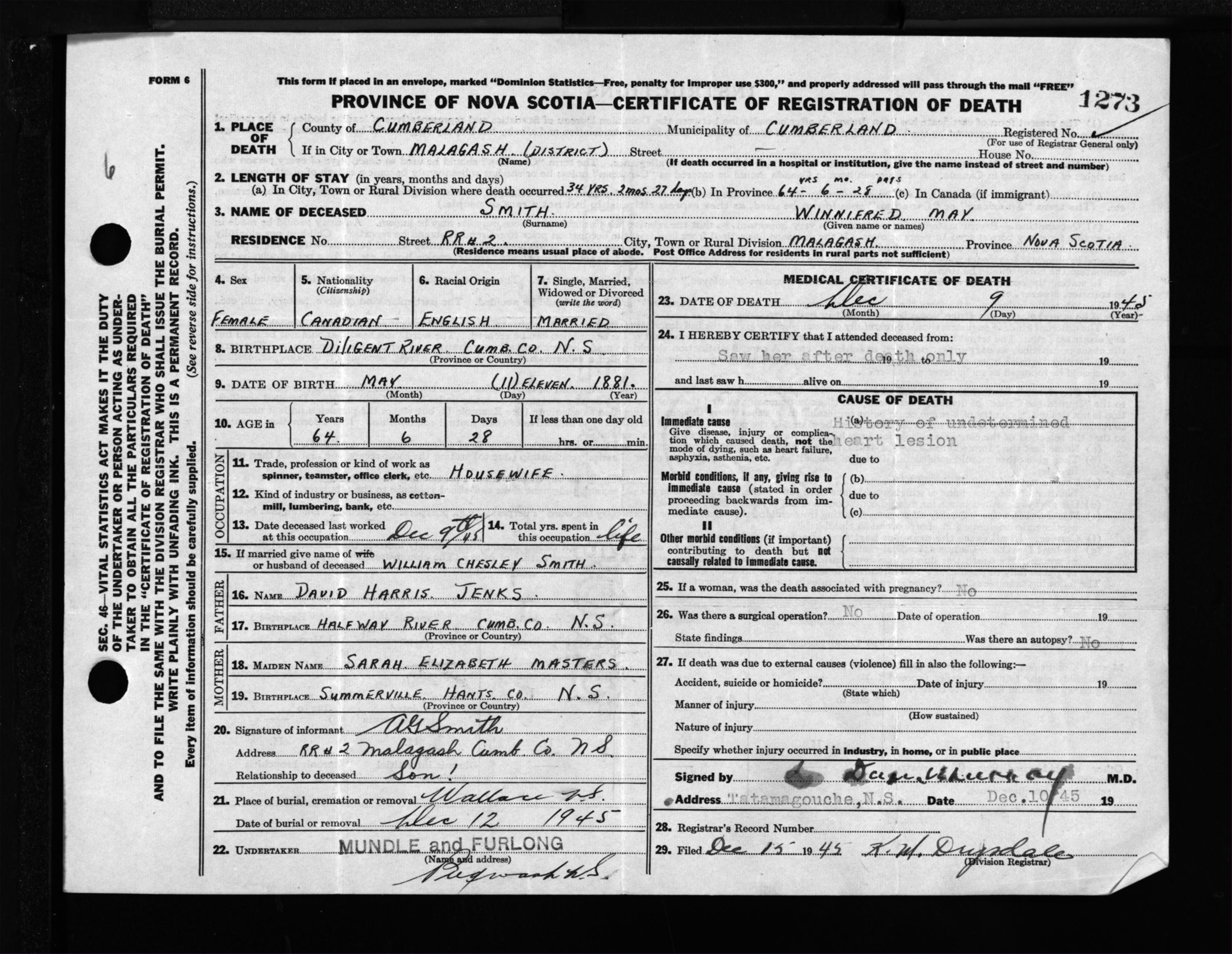 Female Death Registration: Year: 1945 file: 213 number: 1273