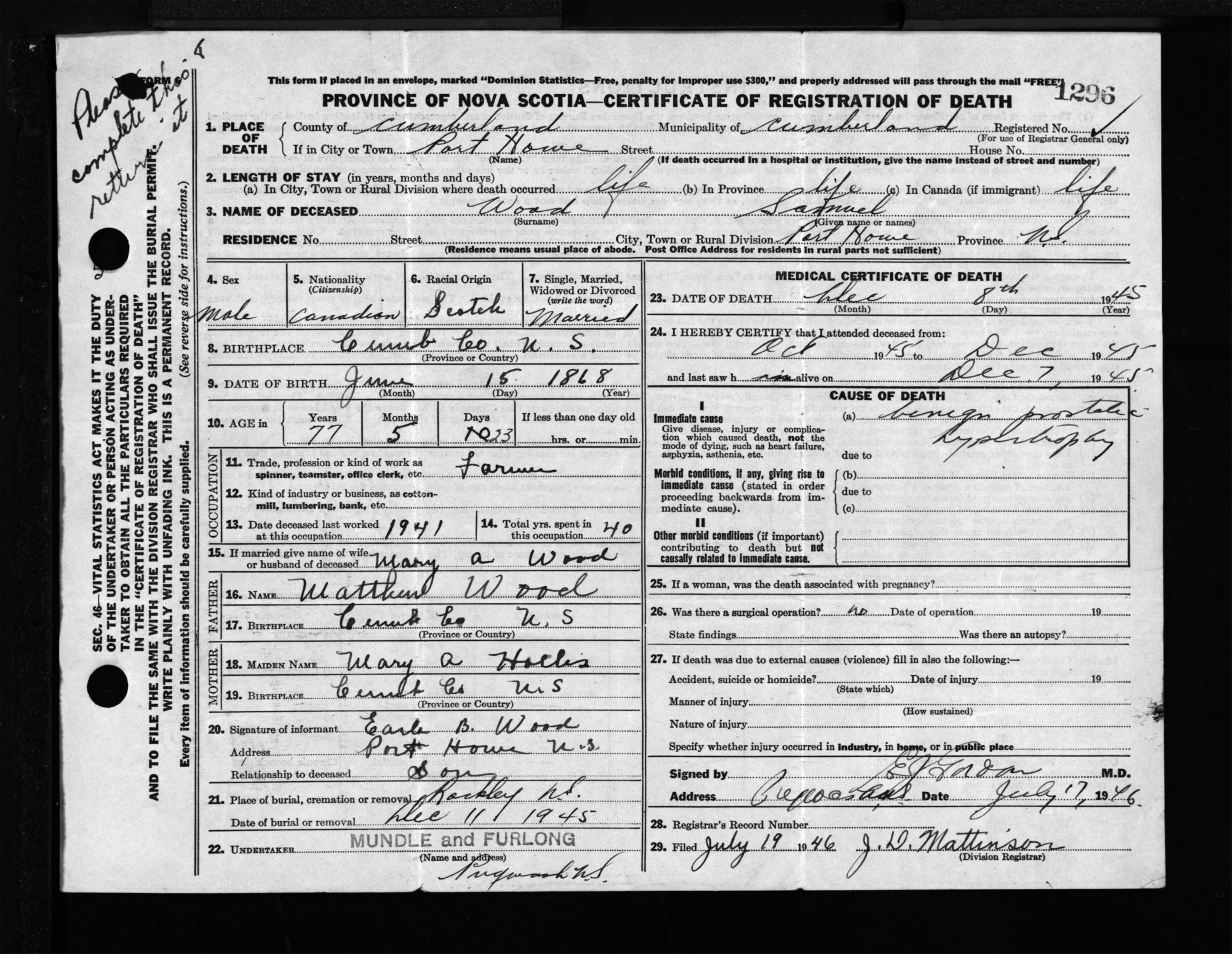 Male Death Registration: Year: 1945 file: 213 number: 1296