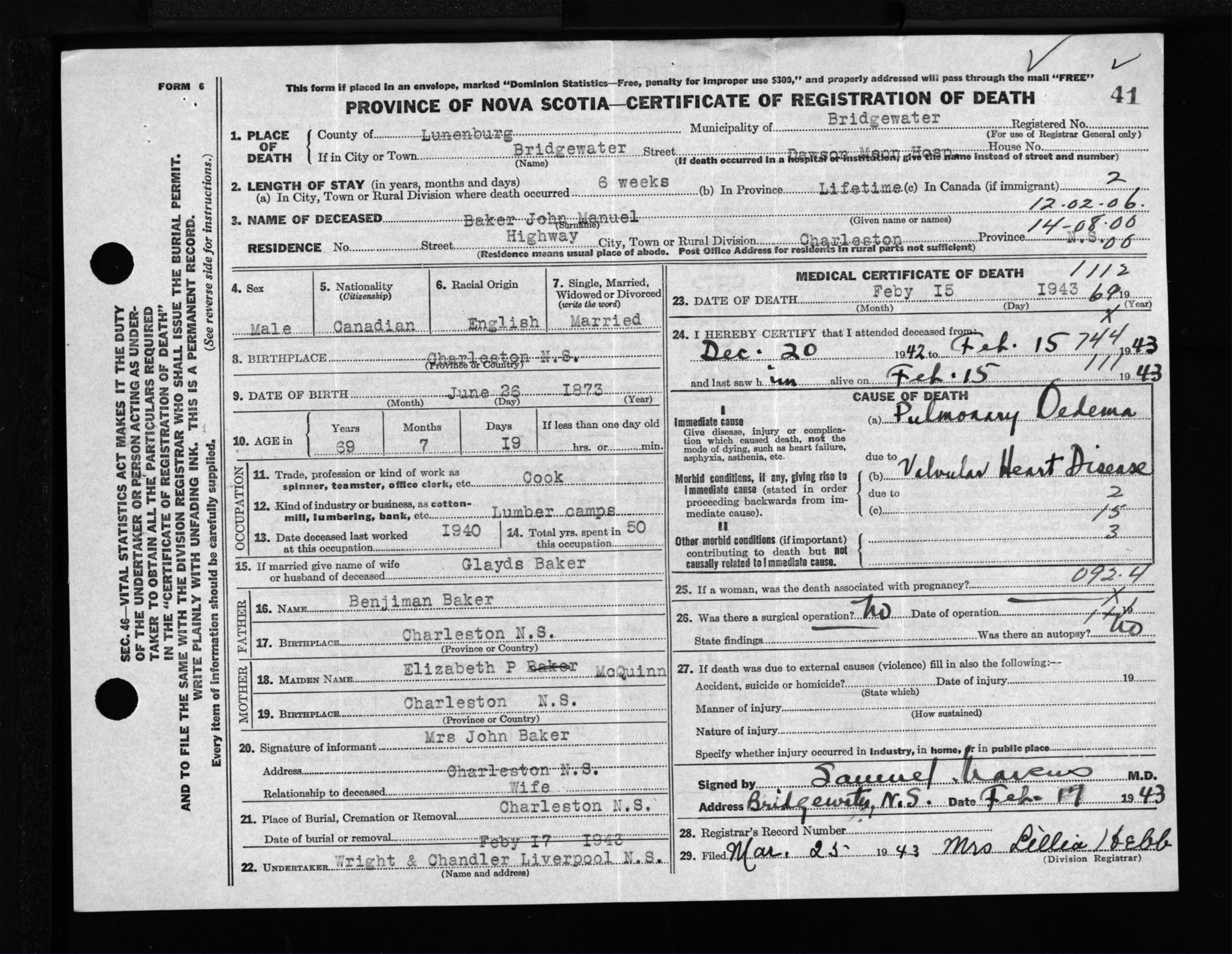 Male Death Registration: Year: 1943 file: 214 number: 41