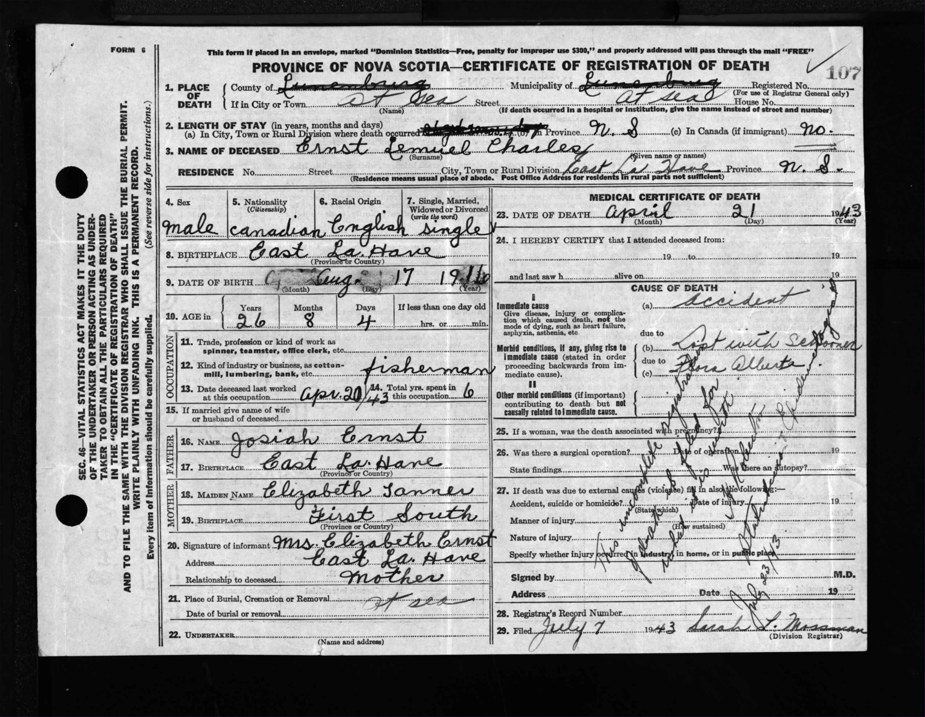 Male Death Registration: Year: 1943 file: 214 number: 107