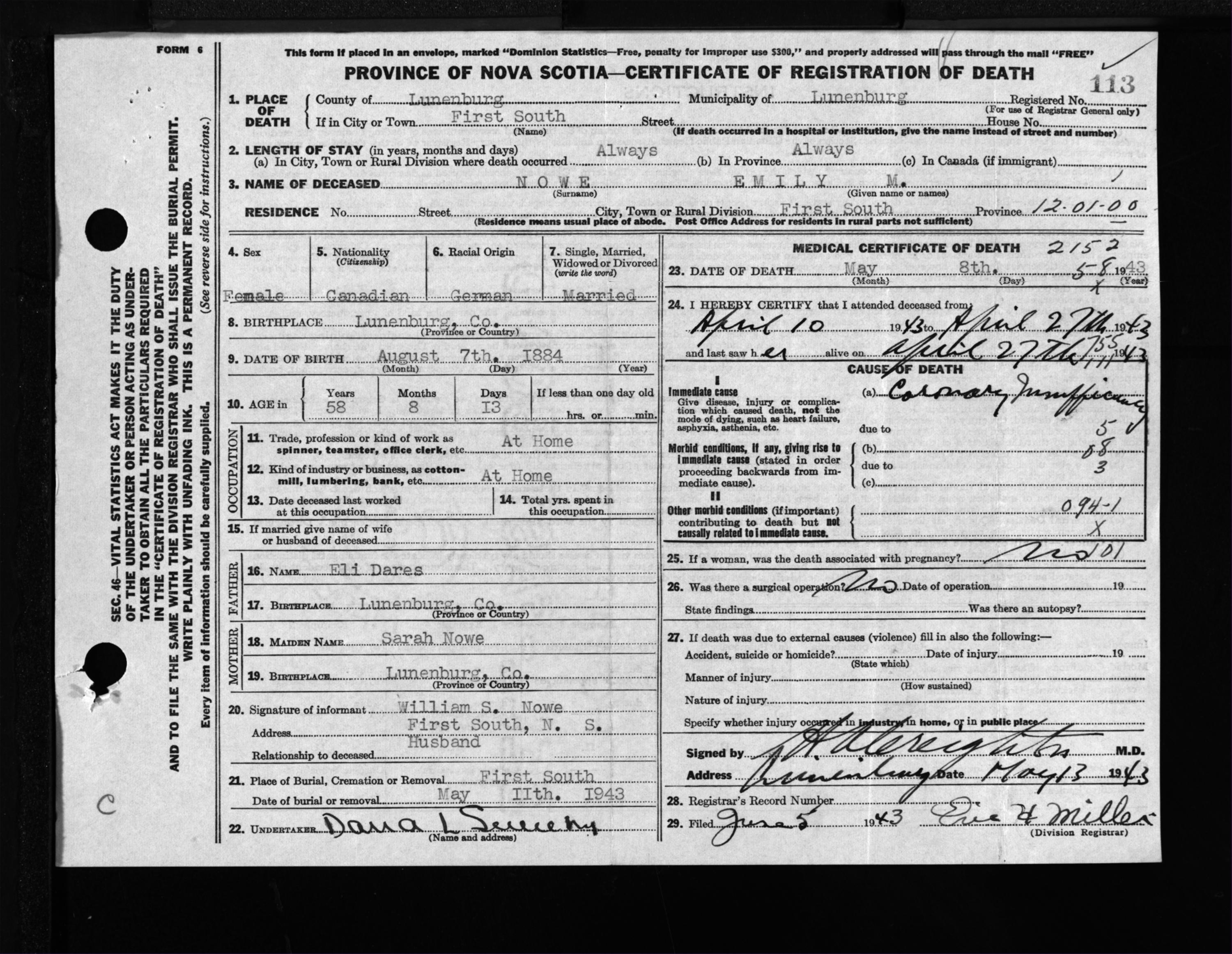 Female Death Registration: Year: 1943 file: 214 number: 113