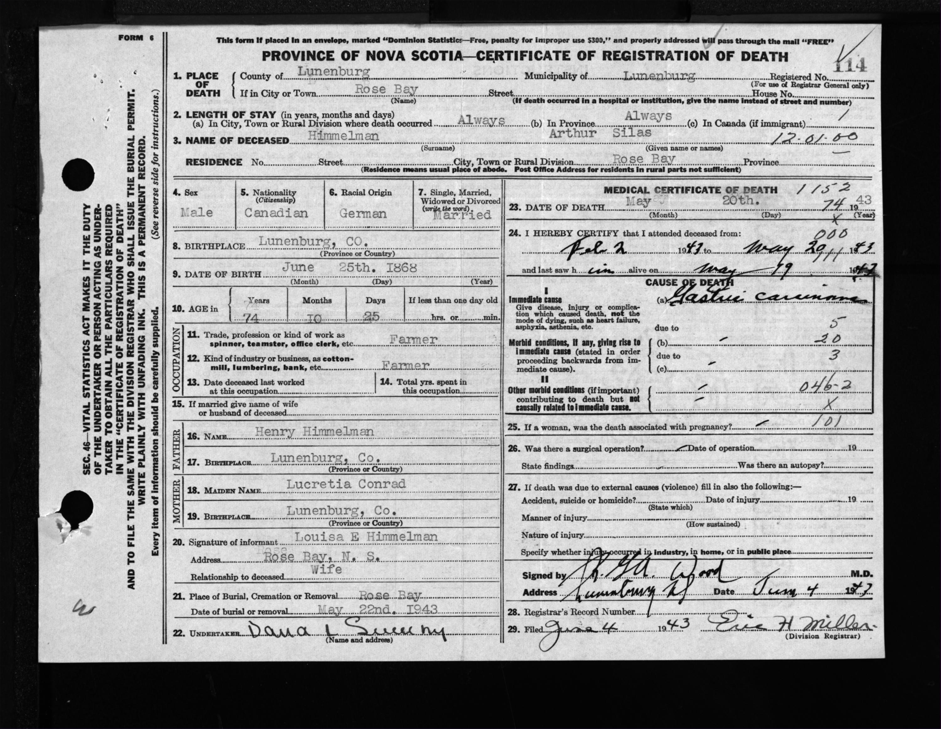 Male Death Registration: Year: 1943 file: 214 number: 114
