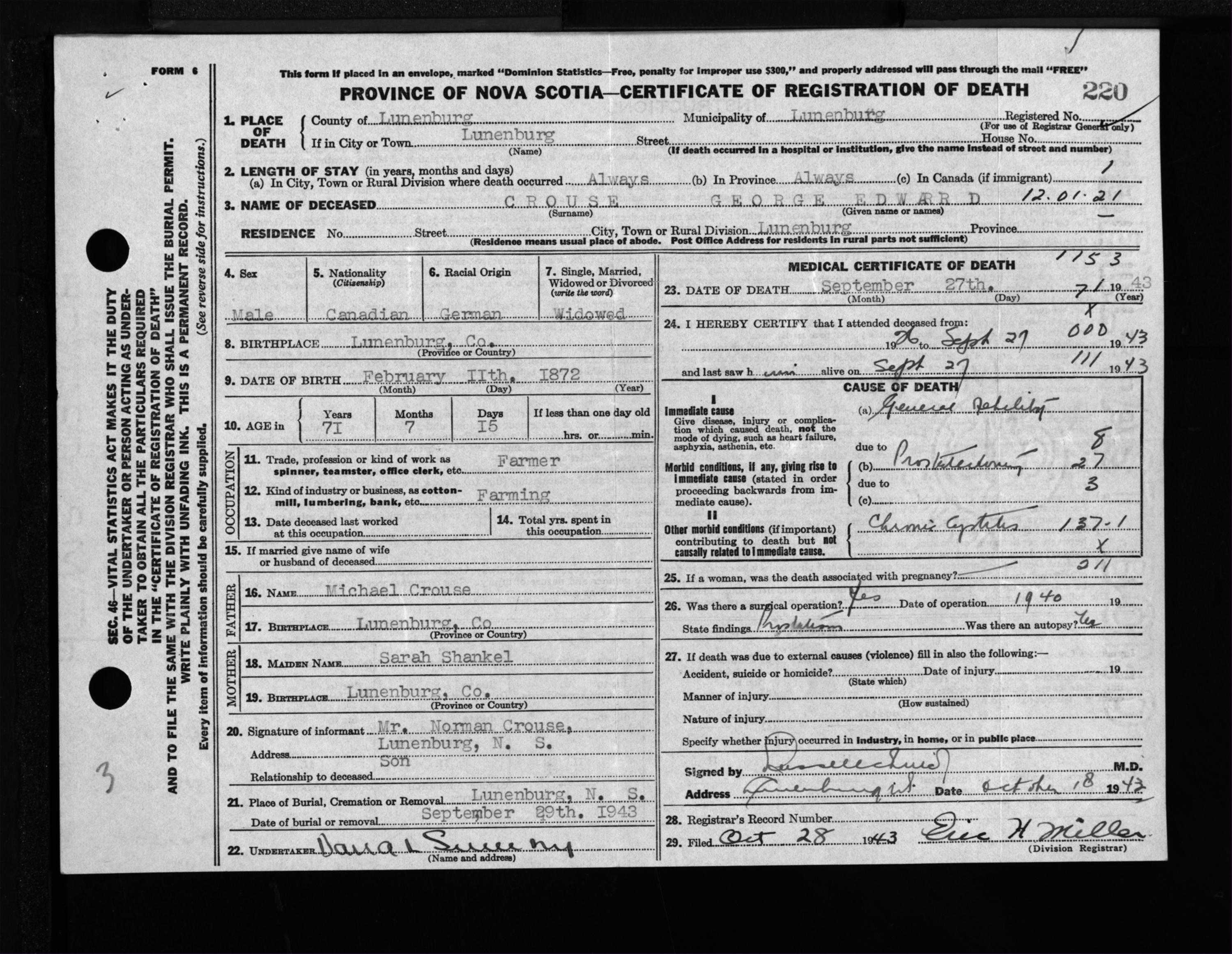 Male Death Registration: Year: 1943 file: 214 number: 220