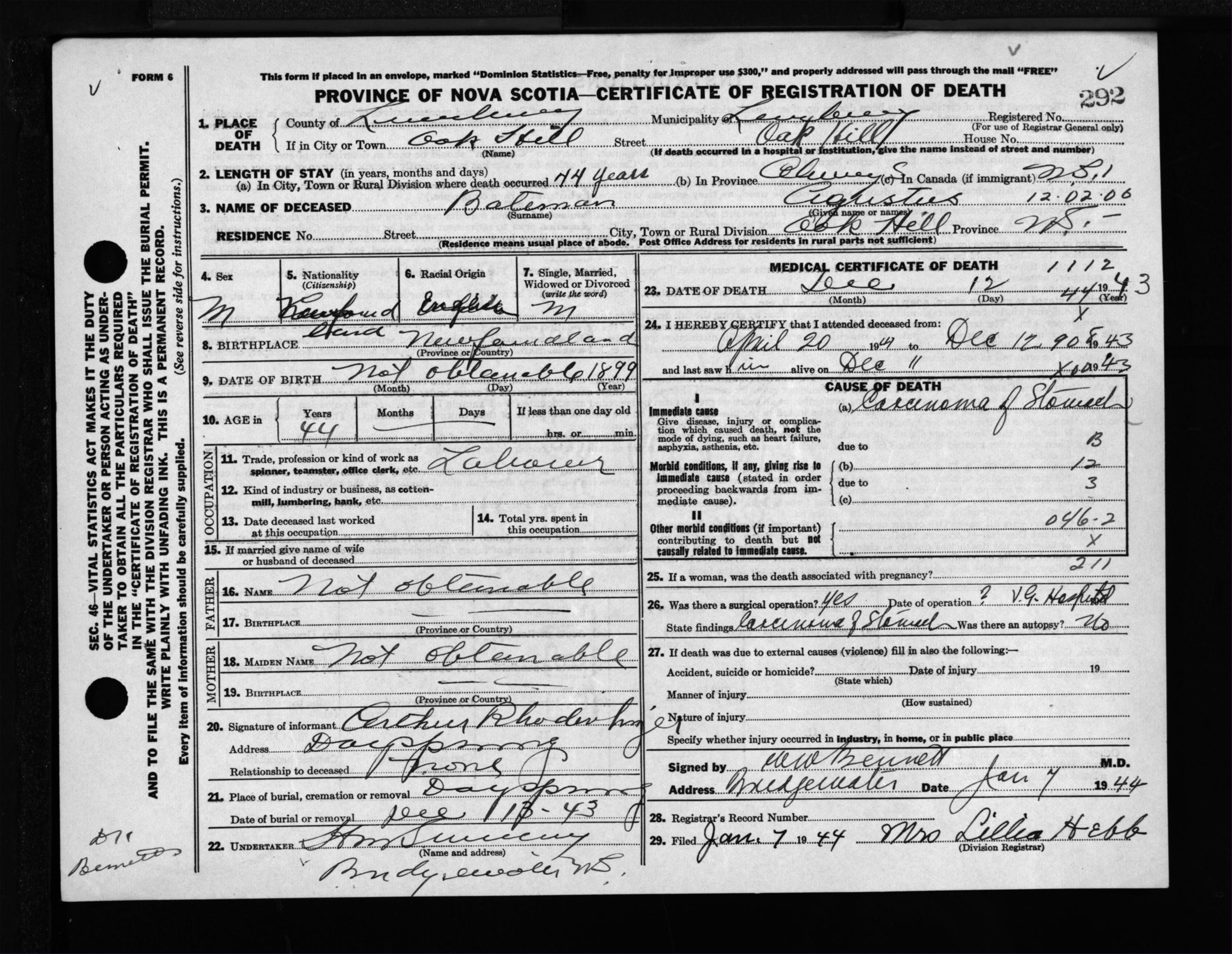 Male Death Registration: Year: 1943 file: 214 number: 292
