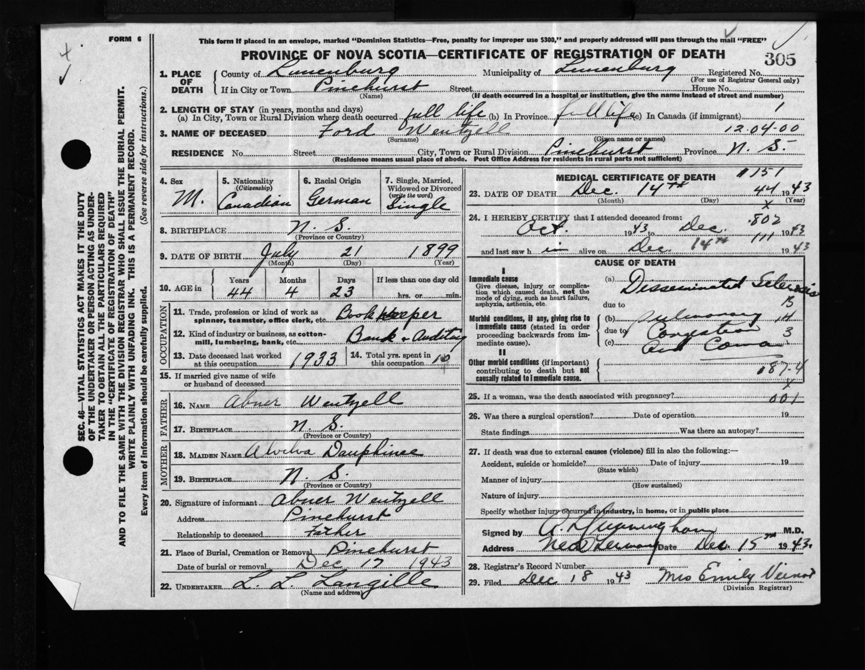 Male Death Registration: Year: 1943 file: 214 number: 305