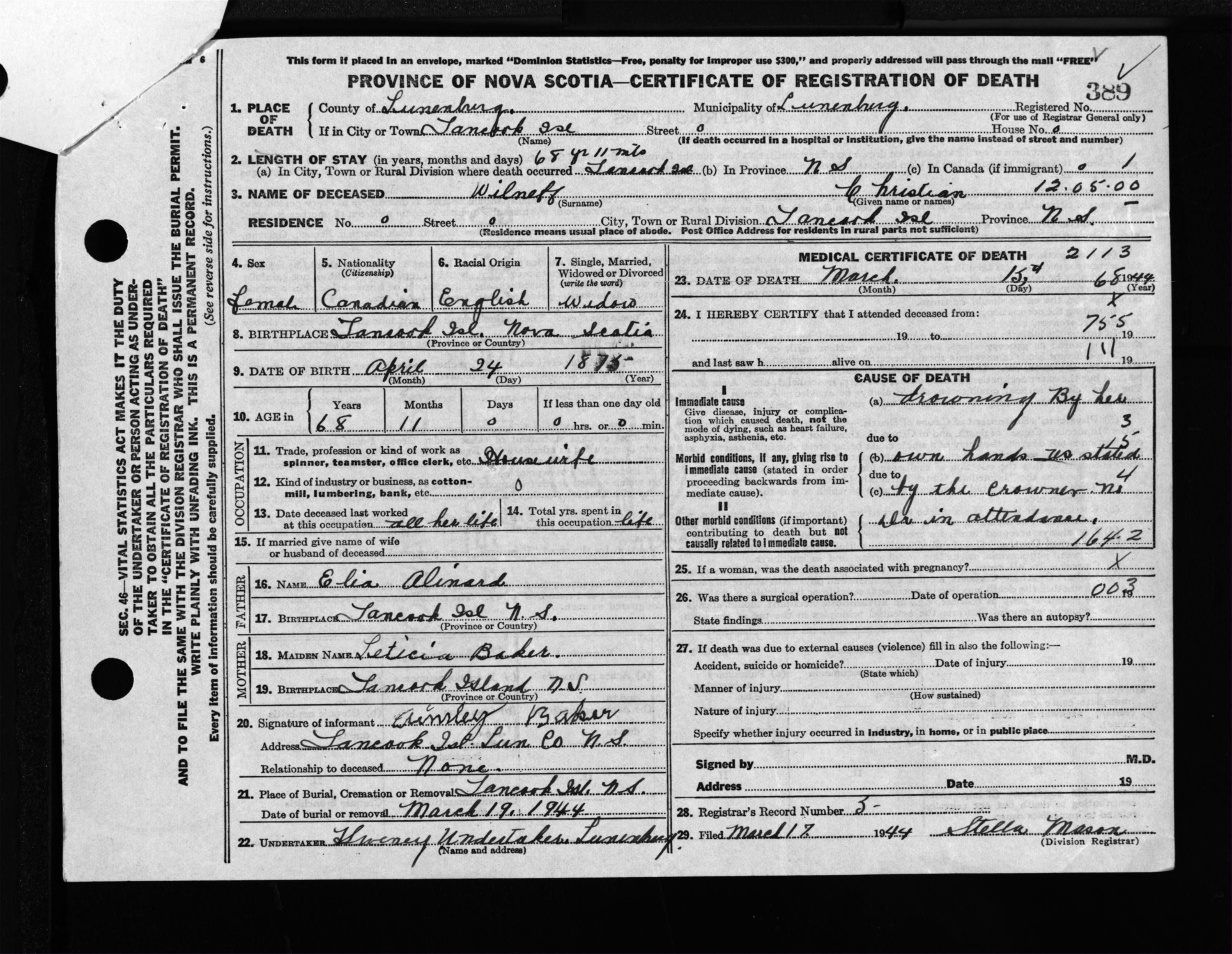 Female Death Registration: Year: 1944 file: 214 number: 389