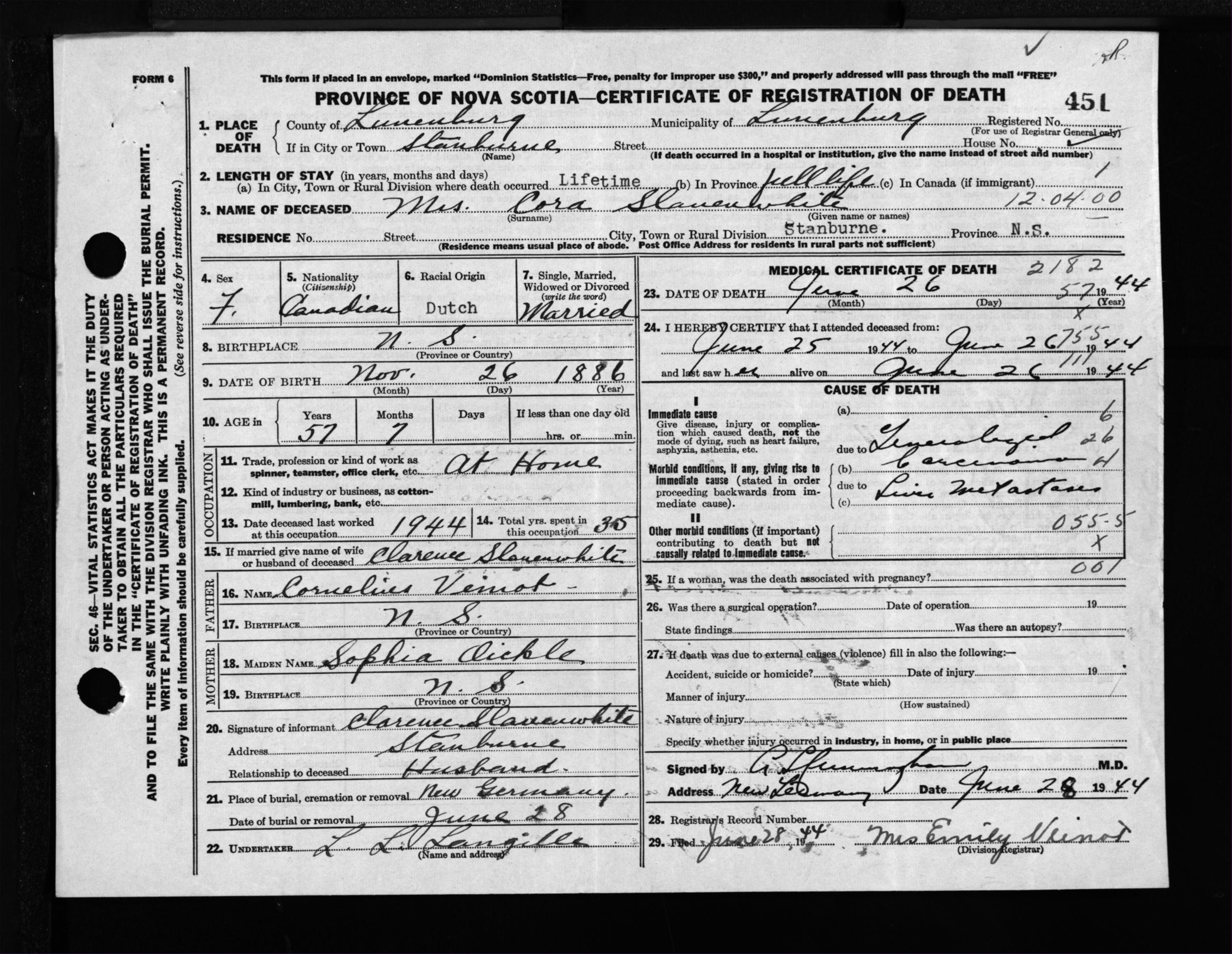 Female Death Registration: Year: 1944 file: 214 number: 451