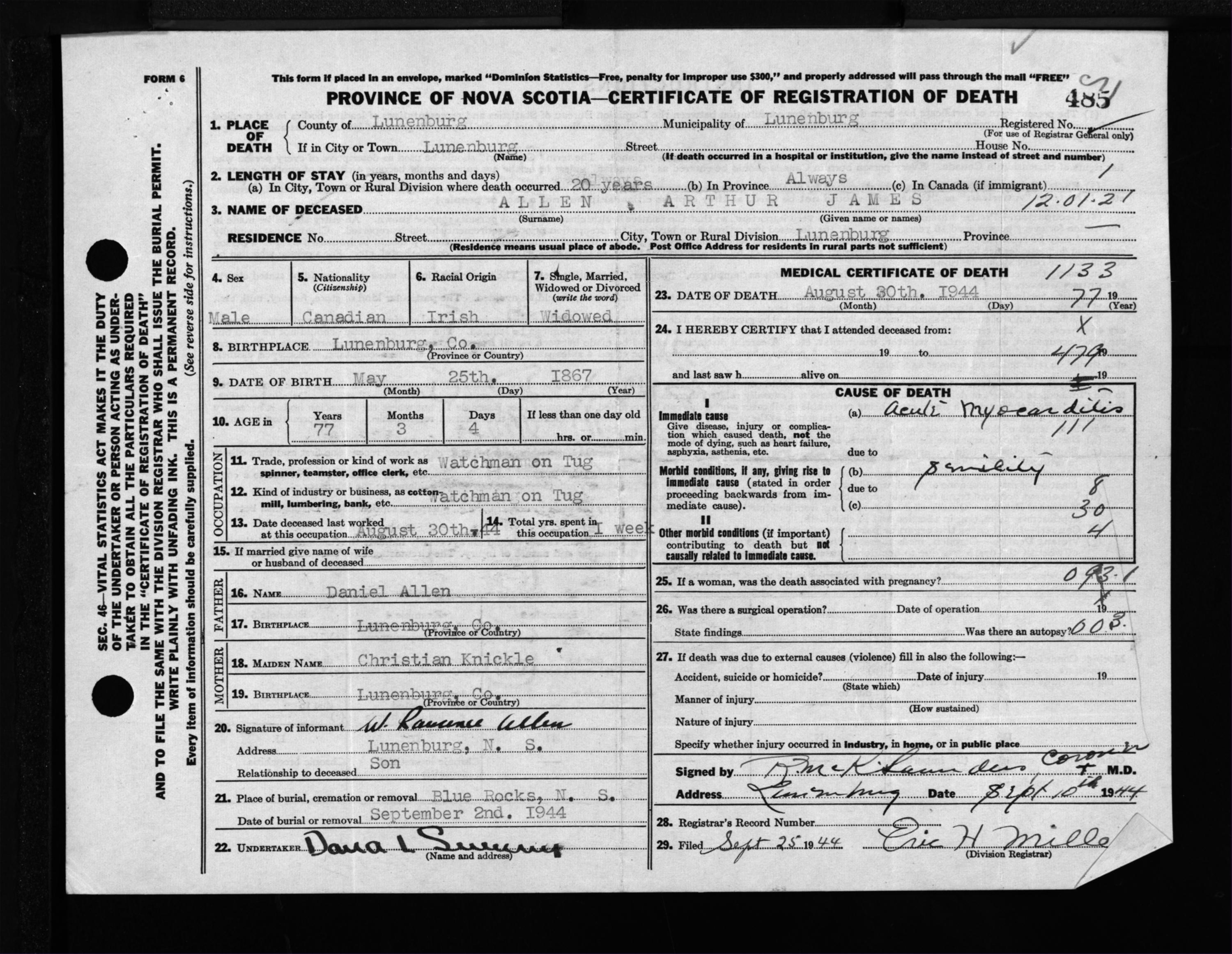 Male Death Registration: Year: 1944 file: 214 number: 485