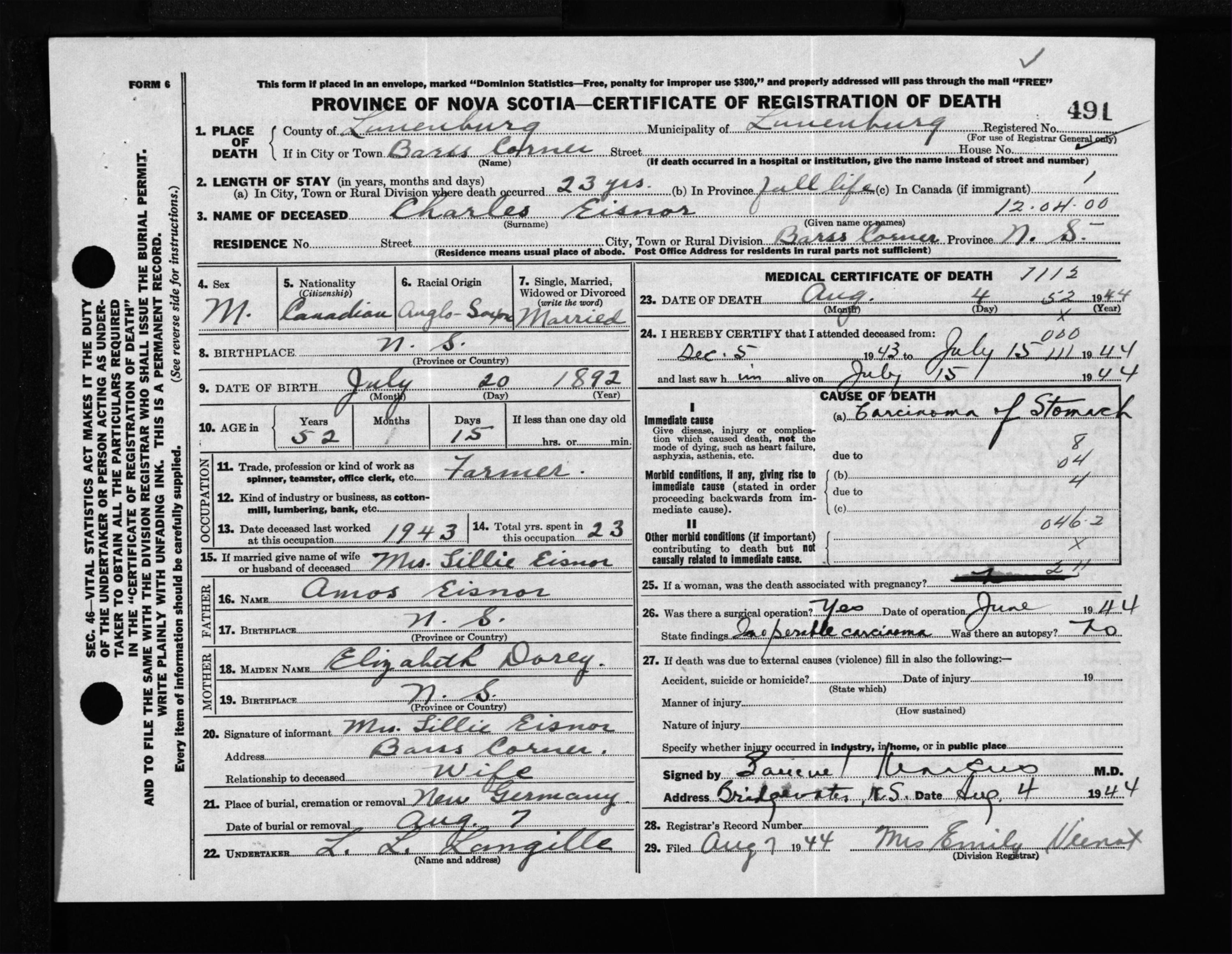 Male Death Registration: Year: 1944 file: 214 number: 491