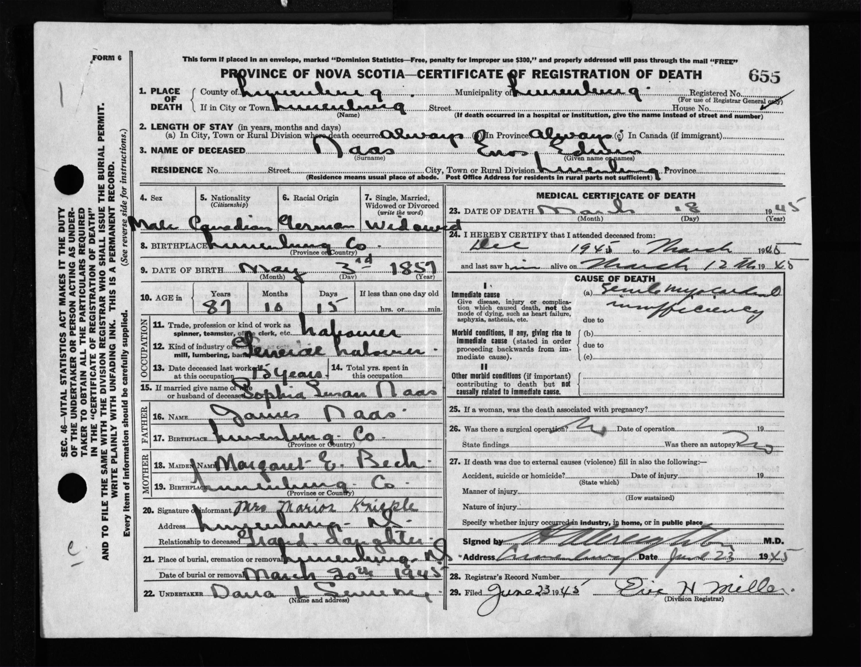 Male Death Registration: Year: 1945 file: 214 number: 655