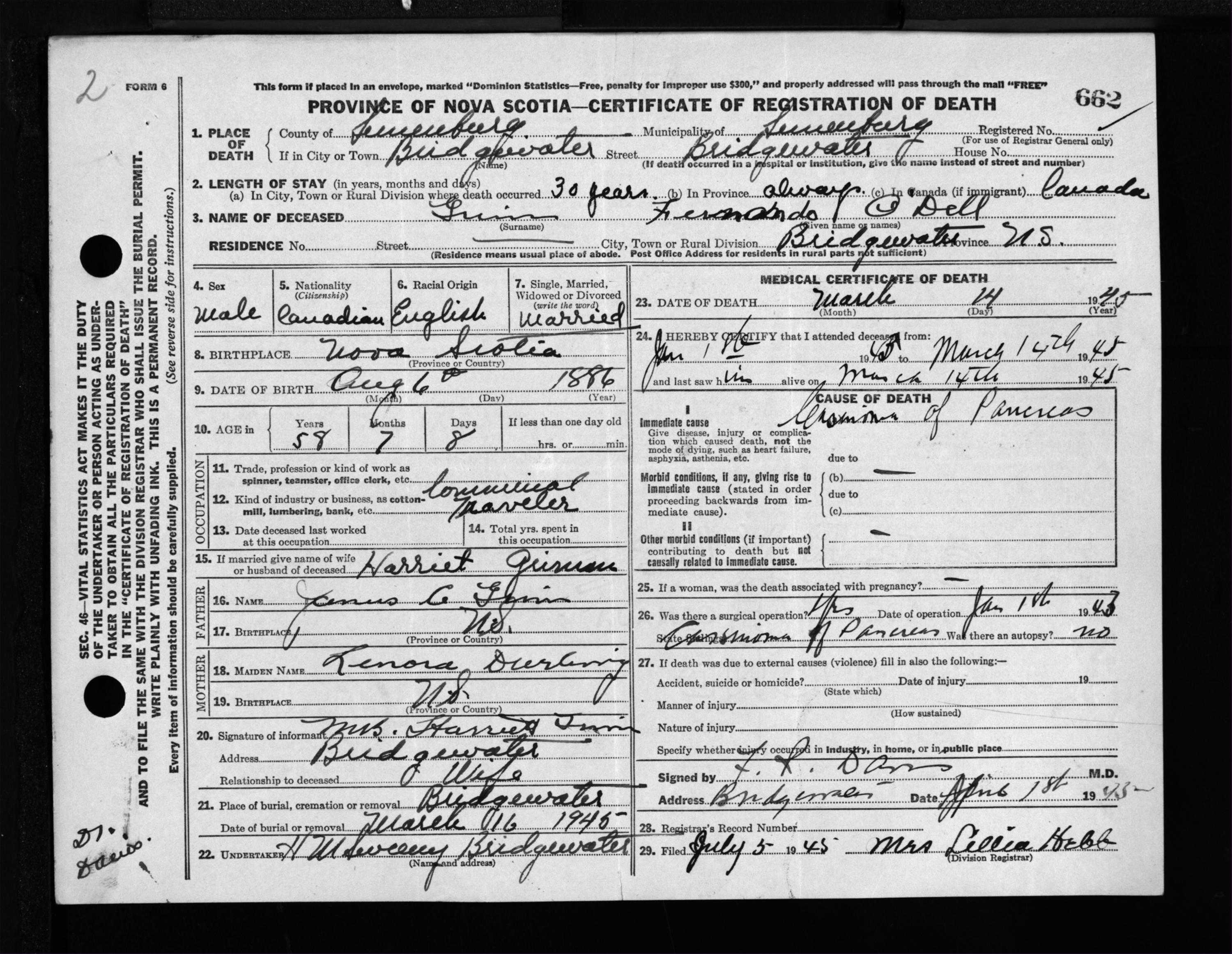 Male Death Registration: Year: 1945 file: 214 number: 662