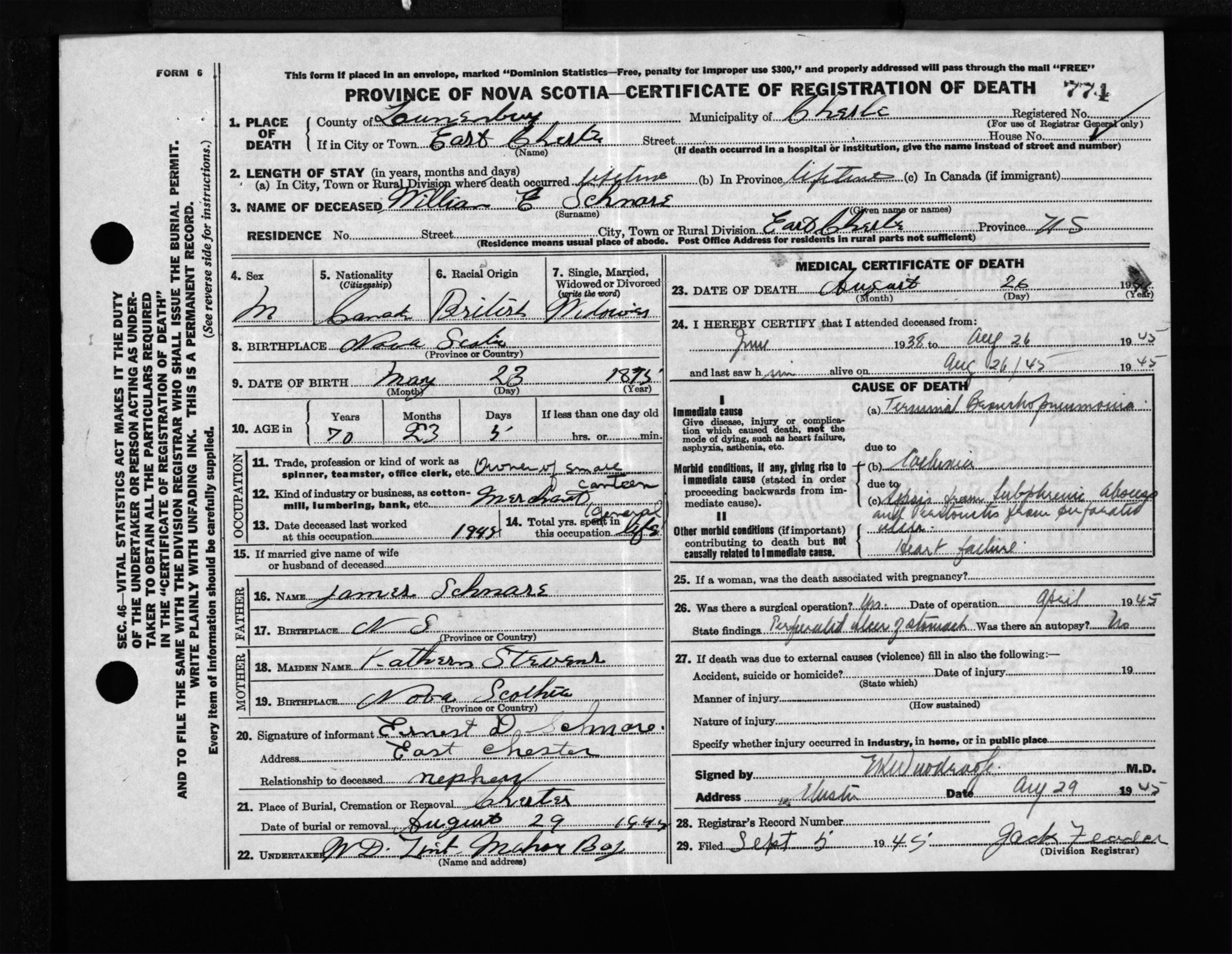 Male Death Registration: Year: 1945 file: 214 number: 774