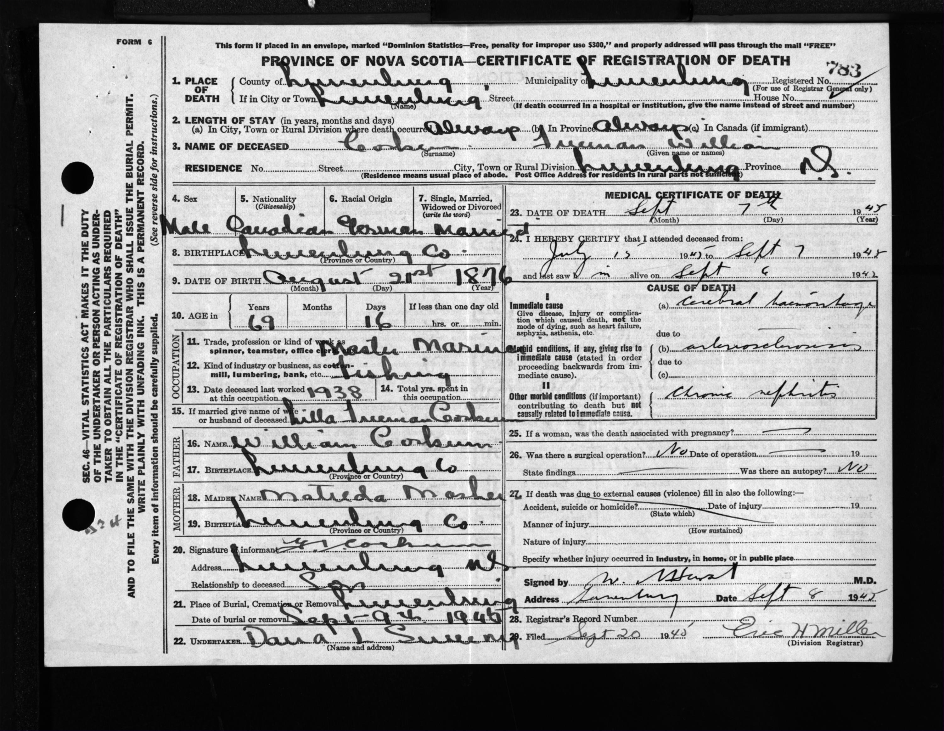 Male Death Registration: Year: 1945 file: 214 number: 783