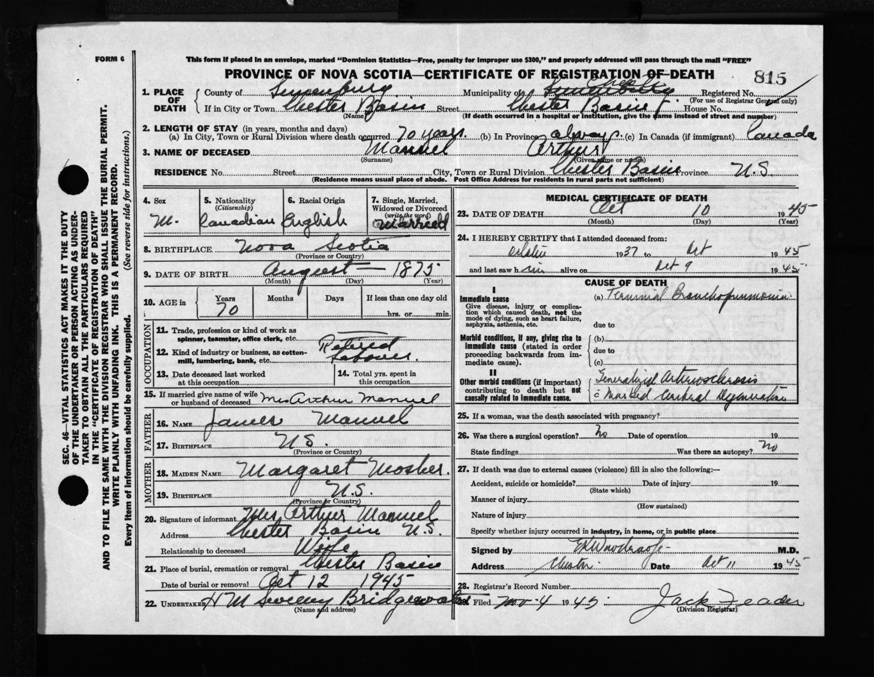 Male Death Registration: Year: 1945 file: 214 number: 815