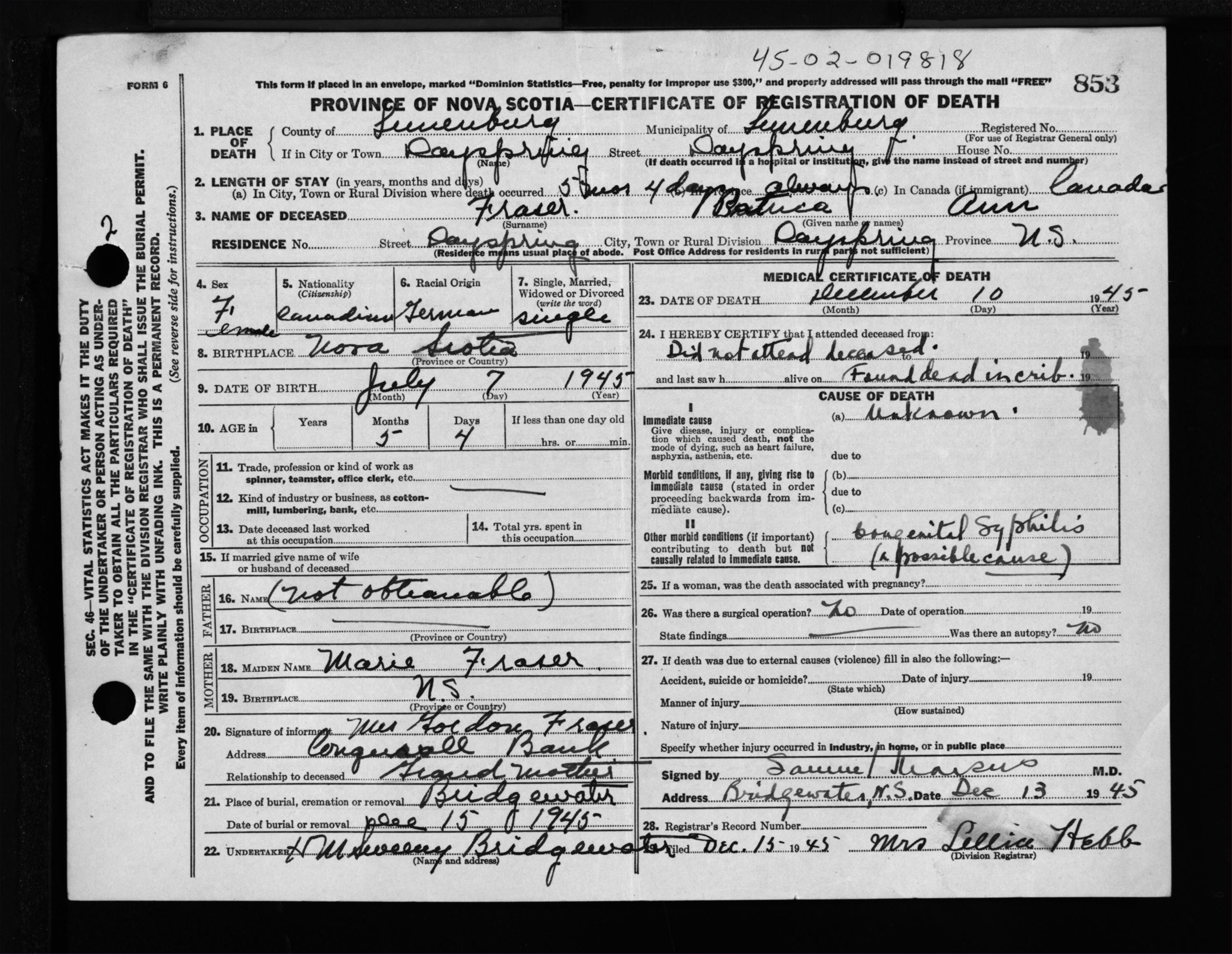 Female Death Registration: Year: 1945 file: 214 number: 853