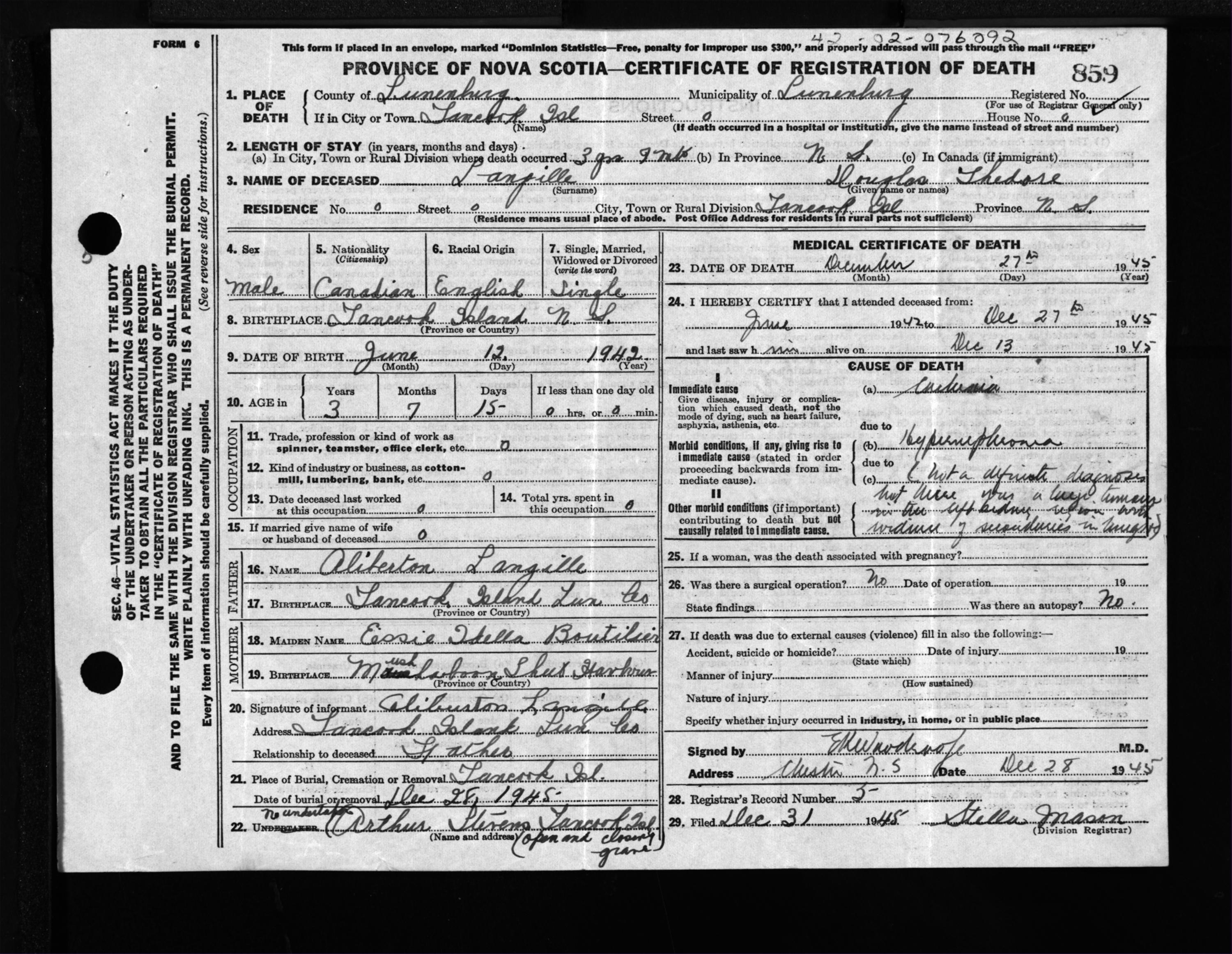 Male Death Registration: Year: 1945 file: 214 number: 859