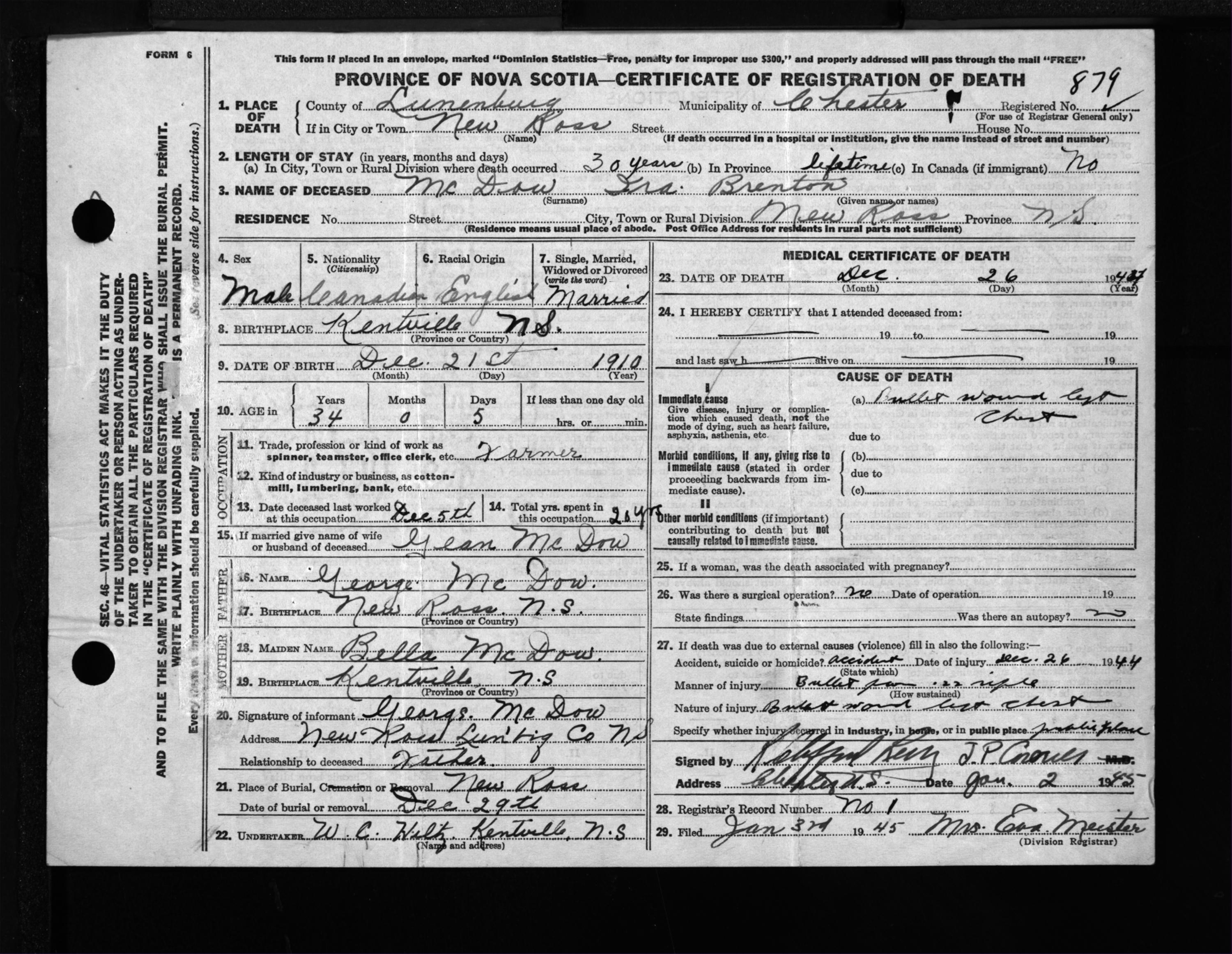 Male Death Registration: Year: 1944 file: 214 number: 879