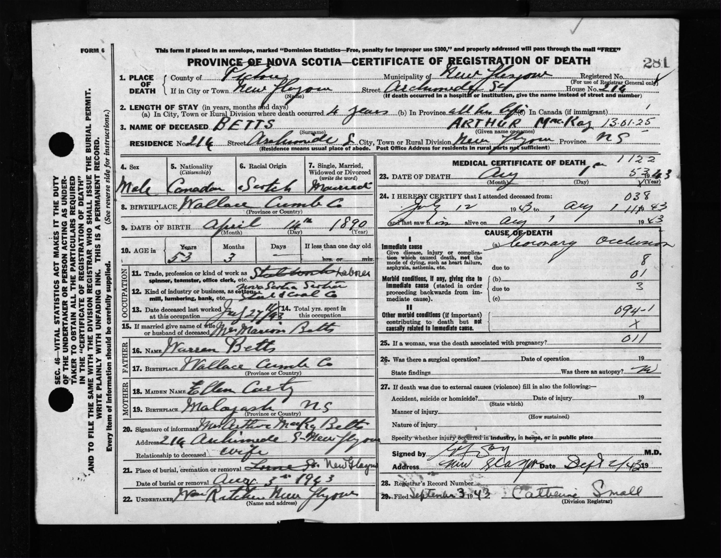 Male Death Registration: Year: 1943 file: 215 number: 281