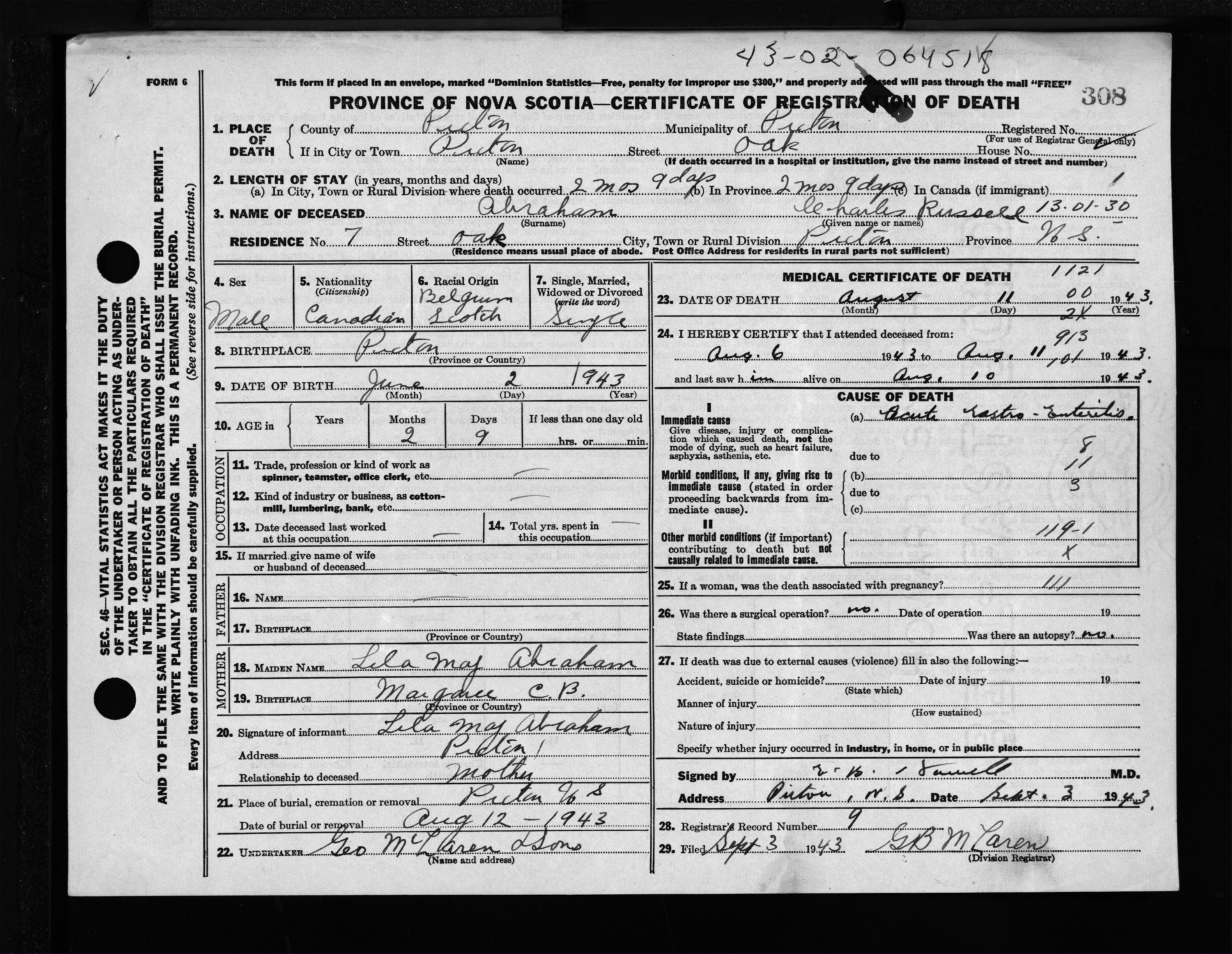 Male Death Registration: Year: 1943 file: 215 number: 308
