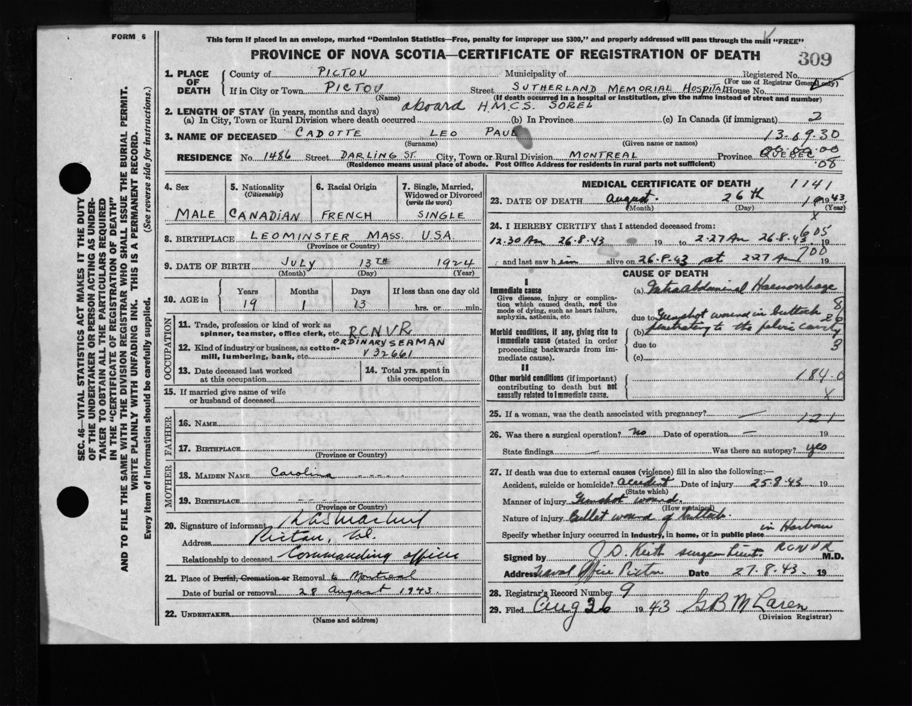 Male Death Registration: Year: 1943 file: 215 number: 309